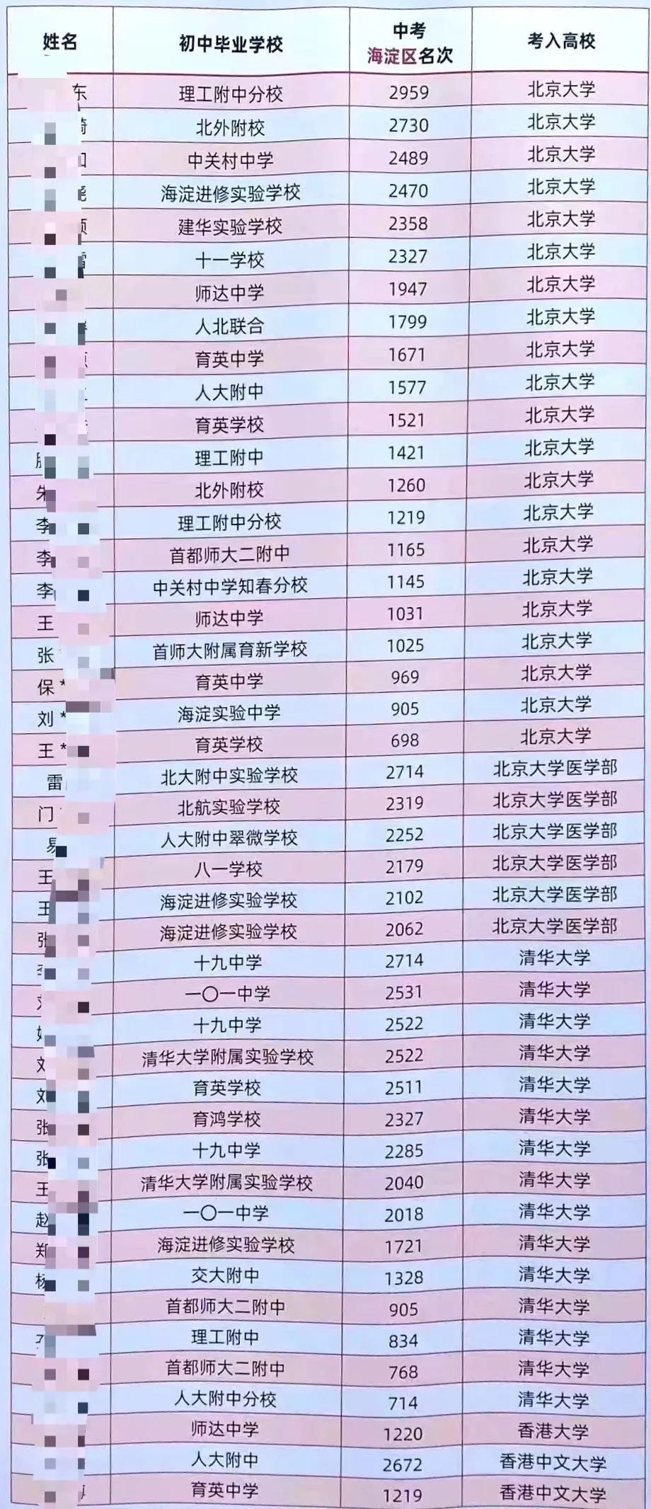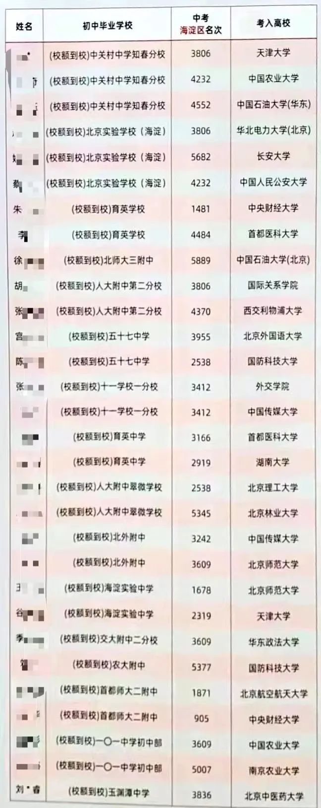 近日,海淀六小强之一的SSF贴出了近几年部分学生的高考情况,包括统招考入SSF和校额到校进入SSF学生的初中毕业学校、中考海淀区名次和考入的高校。分享给大家供大家参考。