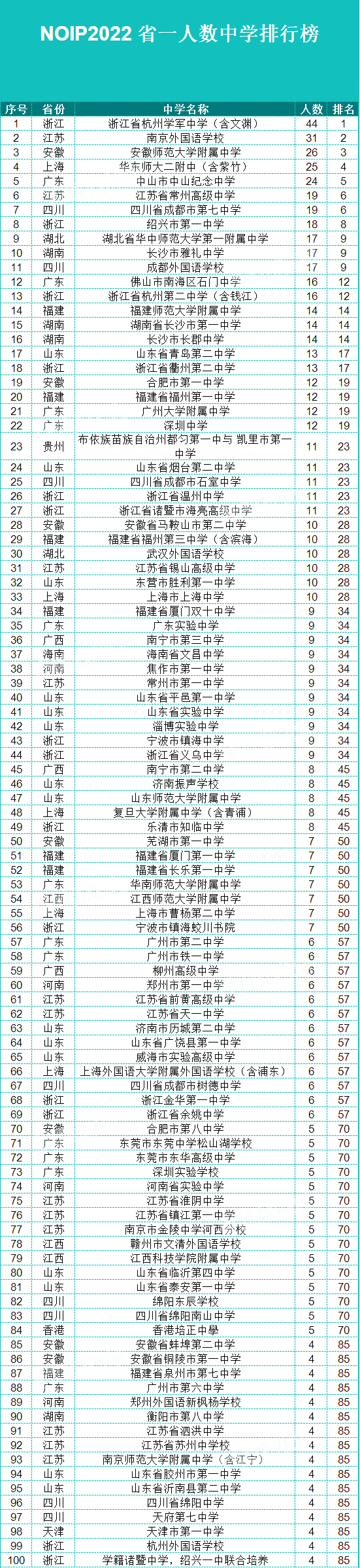 根据统计,NOIP2022省一人数最多的10所高校分别是:浙江杭州学军中学(含文渊校区)、南京外国语学校、安徽师大附中、华东师大二附(含紫竹校区)、中山纪念中学、常州高级中学、成都七中、绍兴一中、华中师大一附、长沙雅礼中学和成都外国语中学。