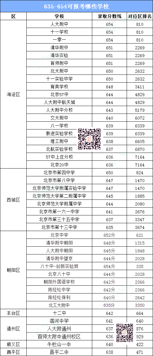 ①根据上表可知,考生分数在635-654之间,基本上都可以报考每个区拔尖学校,如海淀六小强、西城四金刚等等。