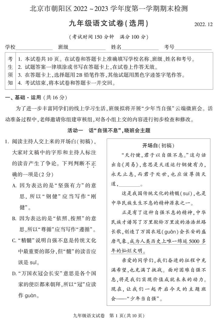 2022-2023学年北京朝阳区初三上语文期末考试已结束,admw360中考网第一时间 为大家整理了相关试题,分享给大家。