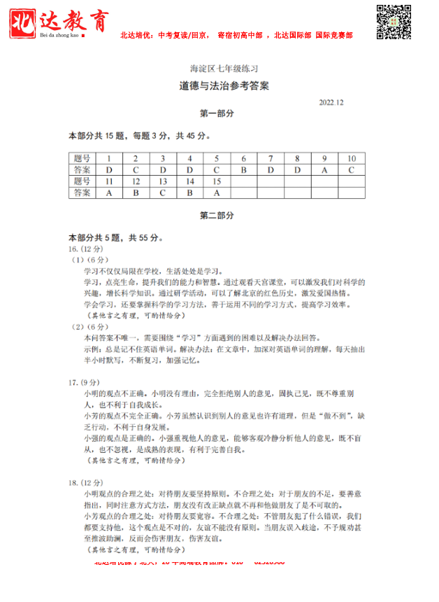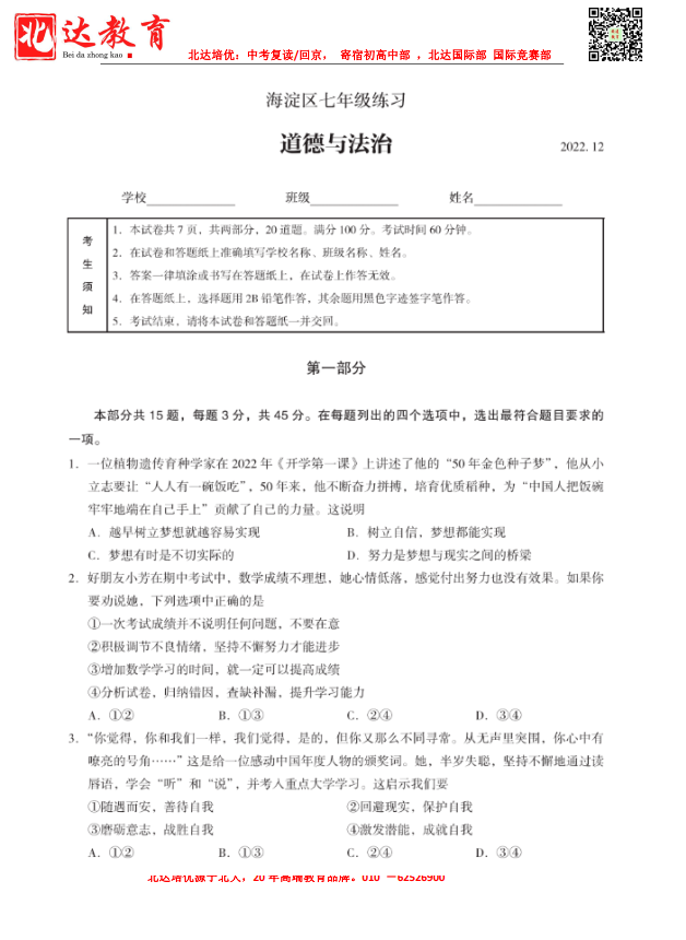 2022-2023学年北京海淀区初一上期末道法考试已结束,admw360中考网第一时间 为大家整理了相关试题,分享给大家。