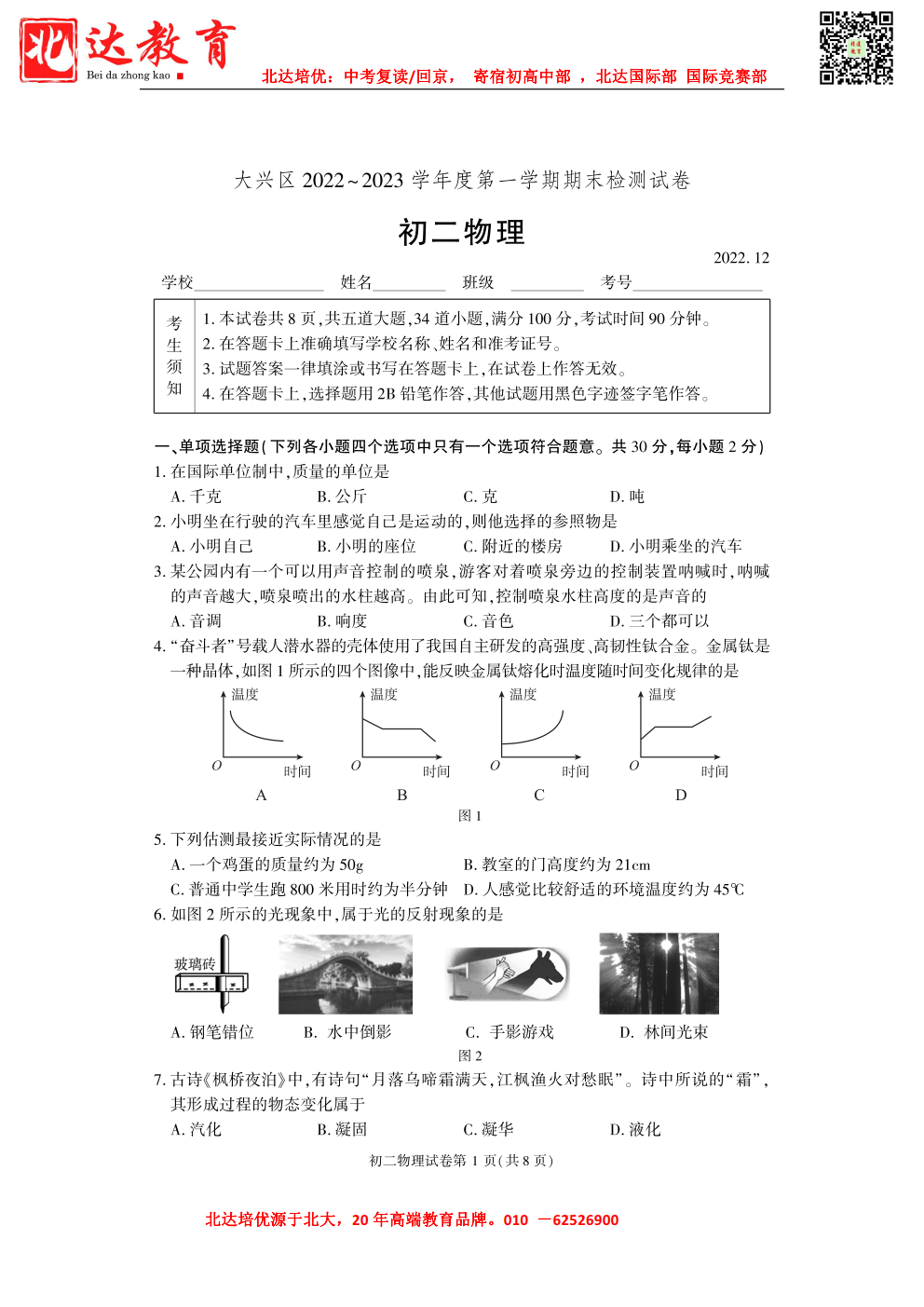 2022-2023学年北京大兴区初二上期末物理考试已结束,admw360中考网第一时间 为大家整理了相关试题及答案,分享给大家。