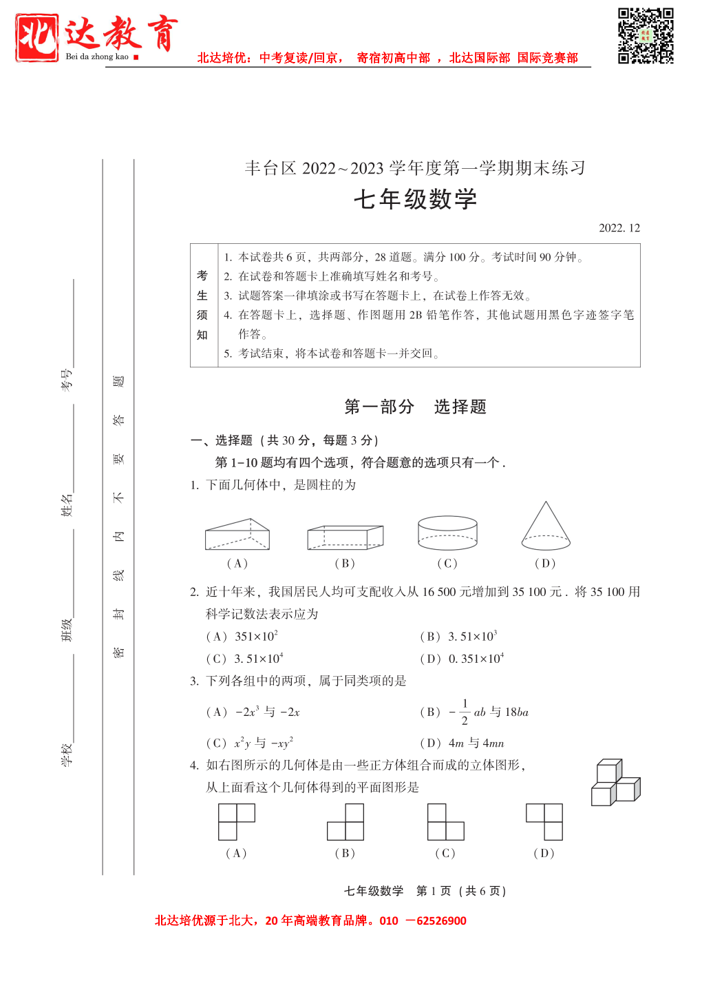 2022-2023学年北京丰台区初一上期末数学考试已结束,admw360中考网第一时间 为大家整理了相关试题及答案,分享给大家。