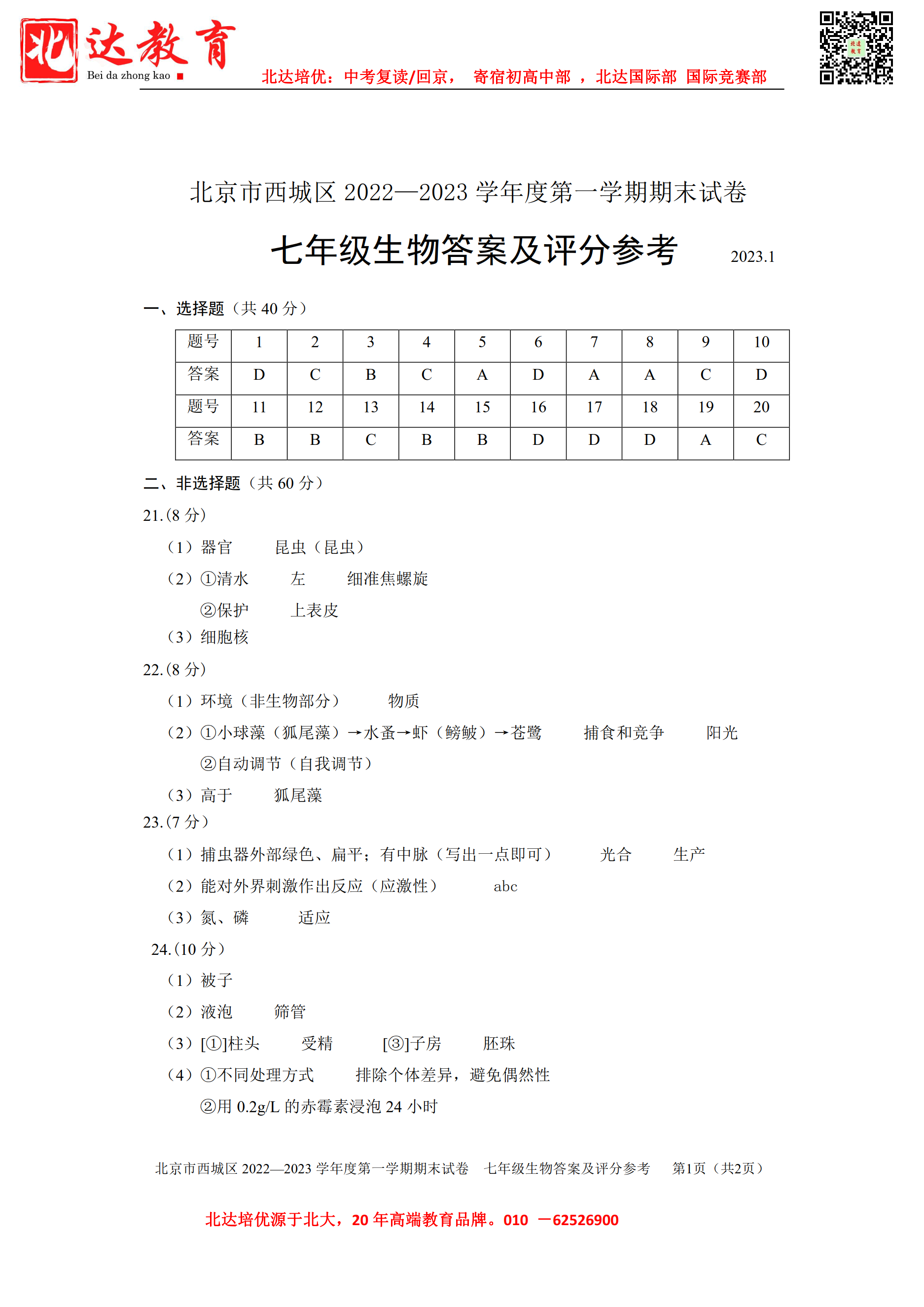 2022-2023学年北京西城区初一上期末生物考试已结束,admw360中考网第一时间 为大家整理了相关试题及答案,分享给大家。
