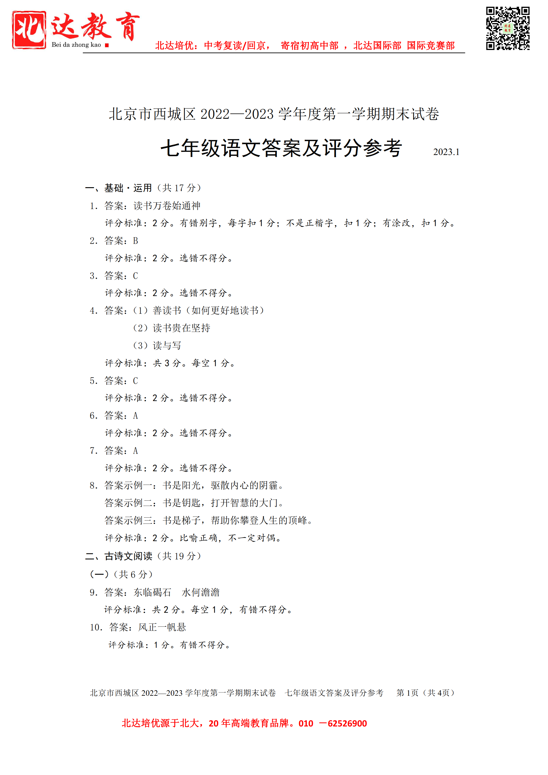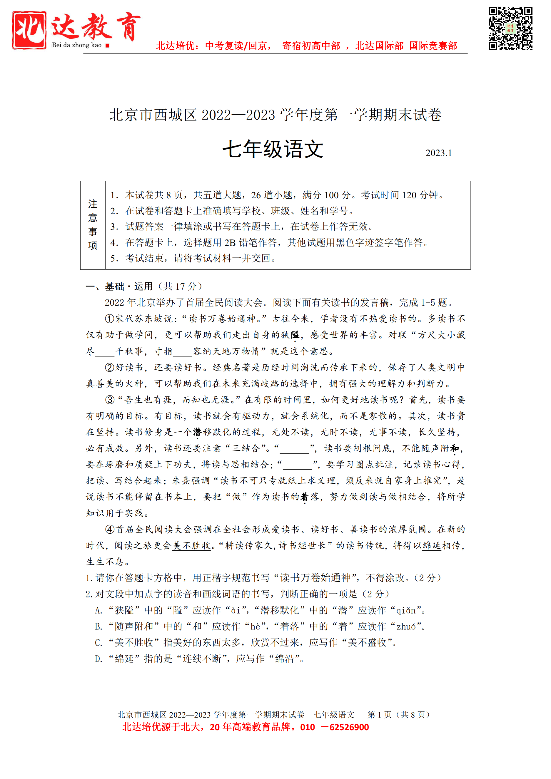 2022-2023学年北京西城区初一上期末语文考试已结束,admw360中考网第一时间 为大家整理了相关试题及答案,分享给大家。