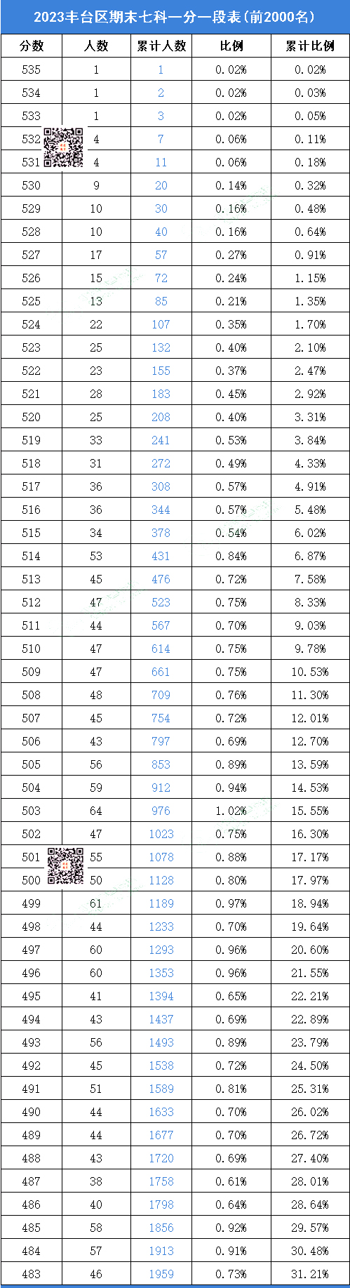 2023丰台初三期末(上)七科一分一段表(前2000名)网传版