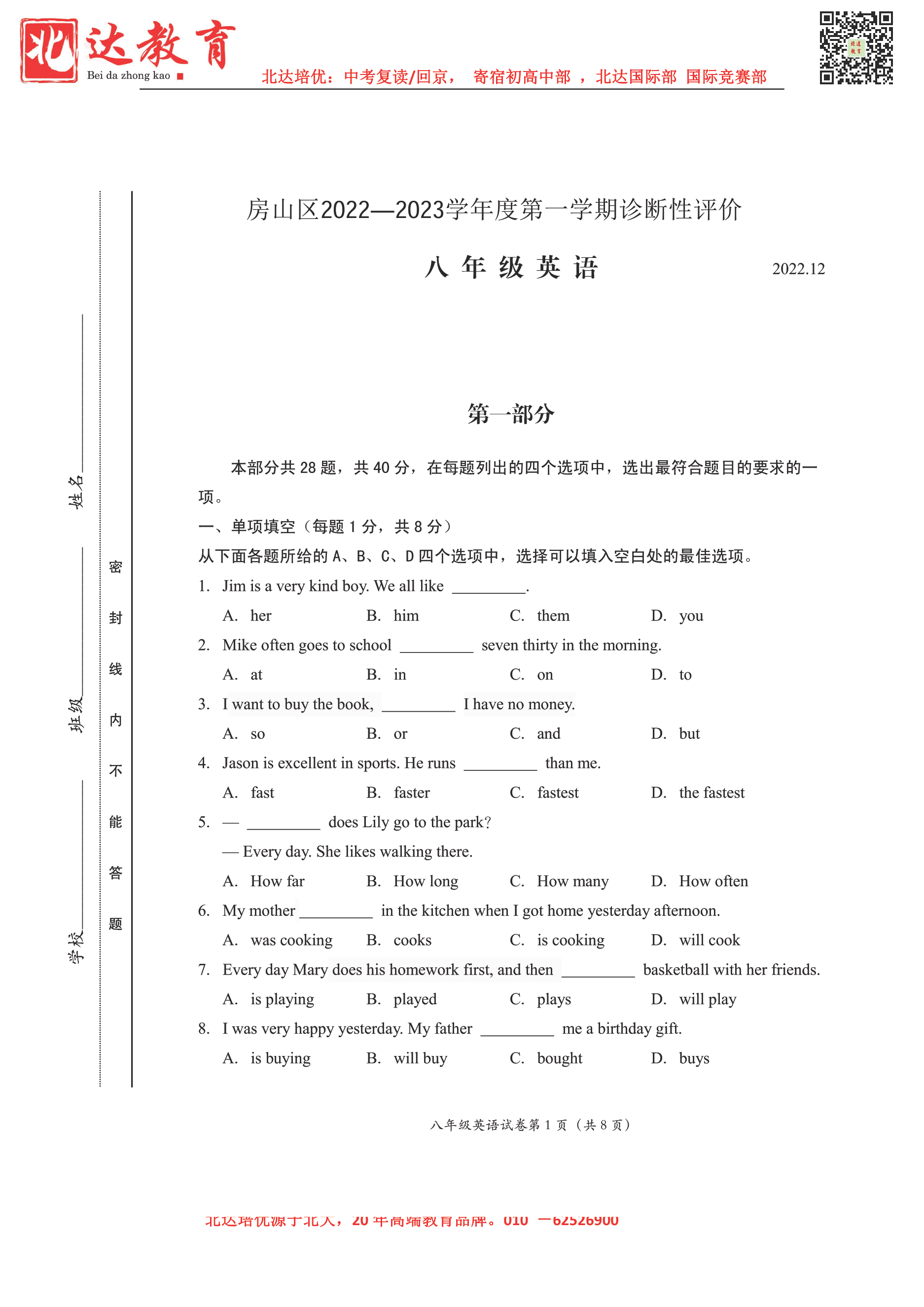 2022-2023学年北京房山区初二上期末英语考试已结束,admw360中考网第一时间 为大家整理了相关试题及答案,分享给大家。