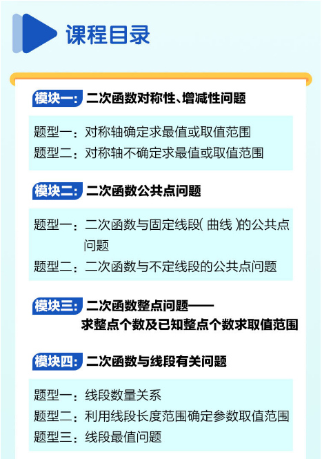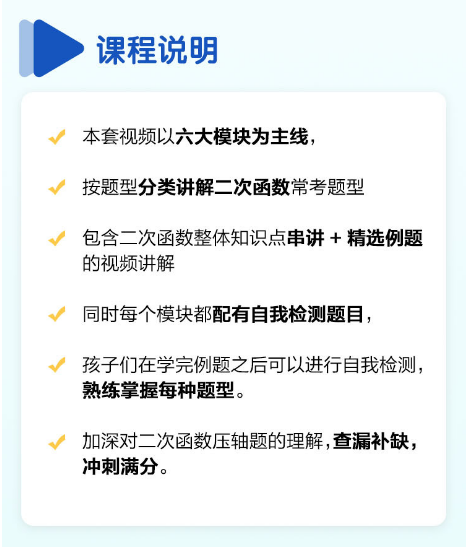 共19个视频解析课,包含二次函数18个知识点以及18道精选例题视频讲解 二次函数作为中考压轴题型考查,重要性不言而喻,期末、模考、中考均以选择最后一题和试卷最后一题考查,大家务必掌…