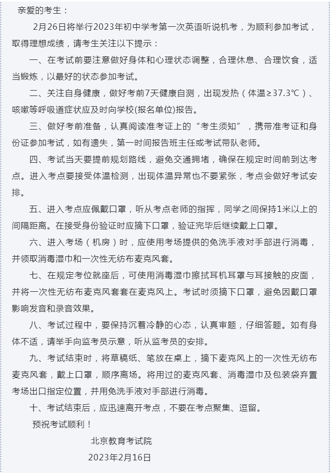 2023年北京市初中学考第一次英语听说机考将于2月26日(周日)举行。2023北京初中英语听说机考考前温馨提示发布,考前7天要做好健康自测。