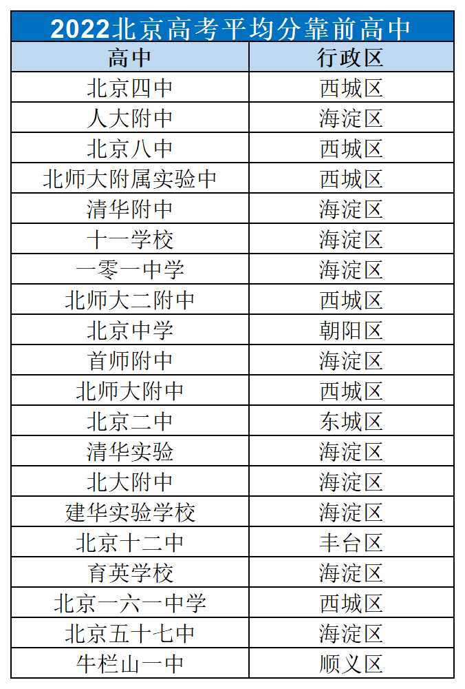 2.以上数据是依据2022高考平均分靠前学校依次整理的,可以看出来,海淀和西城一共17所,占比85%。其中,海淀区占10所,西城为7所。