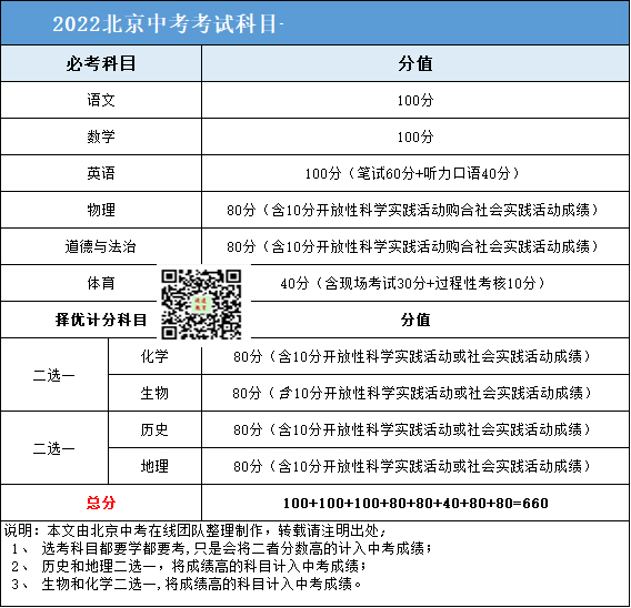 2022北京中考科目及分值