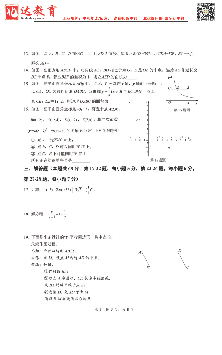 2023北京清华附中初三阶段练习数学试题及答案(3月)