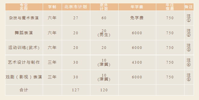 注②:舞蹈表演专业招收小学六年级(含五四制五年级)学生,且京外计划只招收男生。