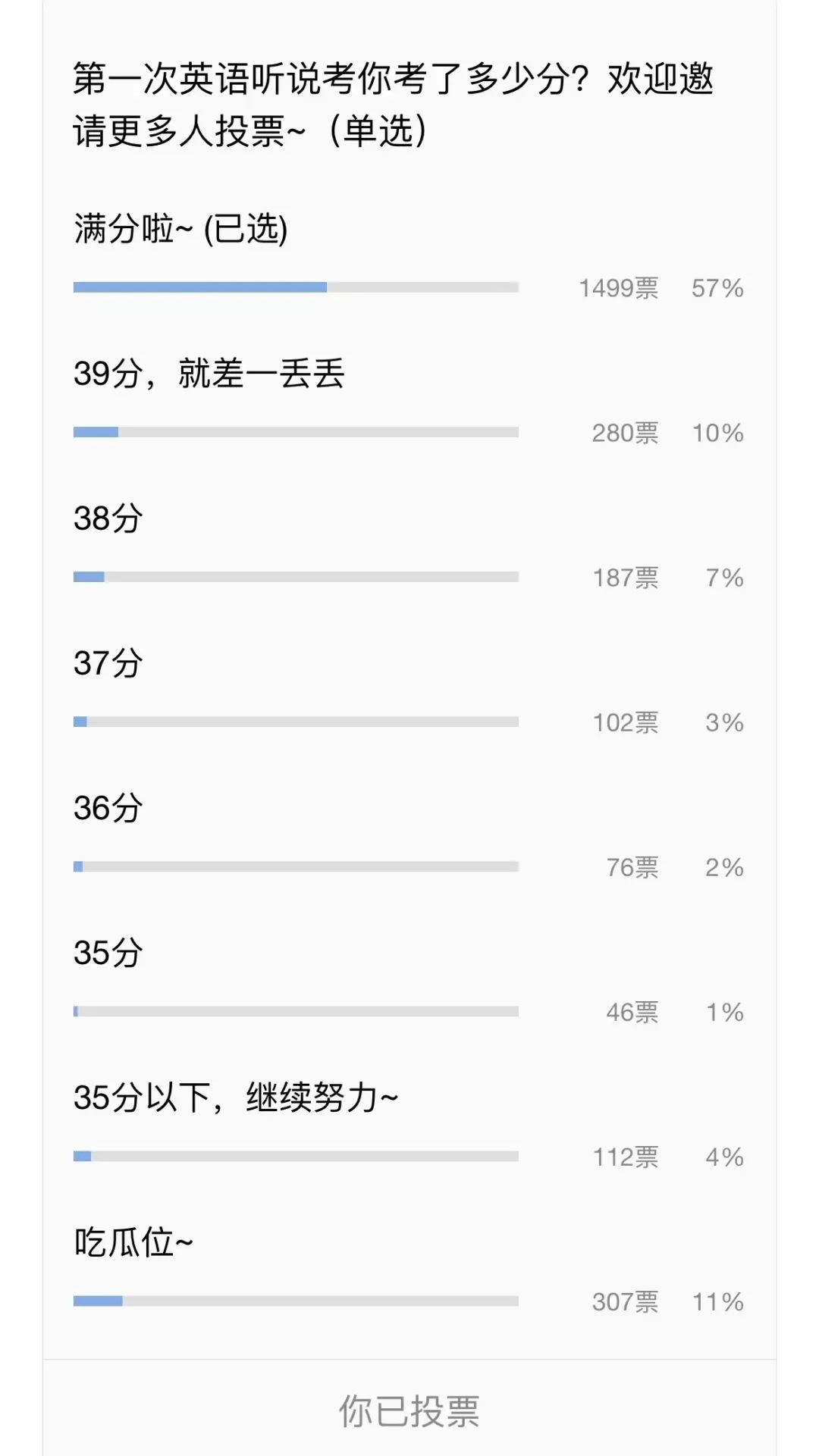 根据网上某机构进行的一个投票统计,这次英语听说考满分率差不多接近60%,所以整体成绩还是相当不错的。当然这个样本数还不算多,差不多有2500人参与投票,有1499人投满分票,满分率57%。