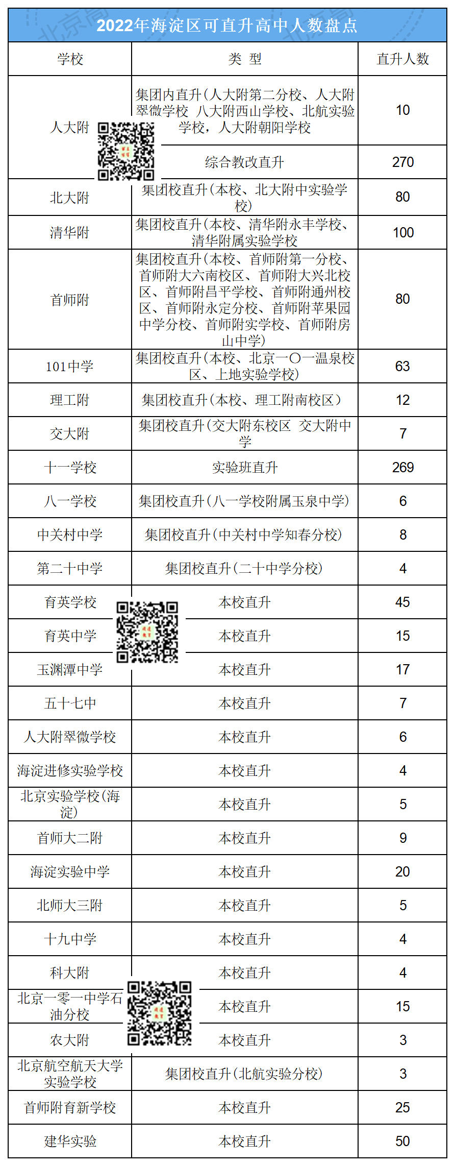通过上表的数据大家也能看出来,海淀各校的直升人数还是有比较大的出入,有一些学校会有实验班直升的方式,有一些学校则是走本校直升,同学们在升学前还是要多多了解。