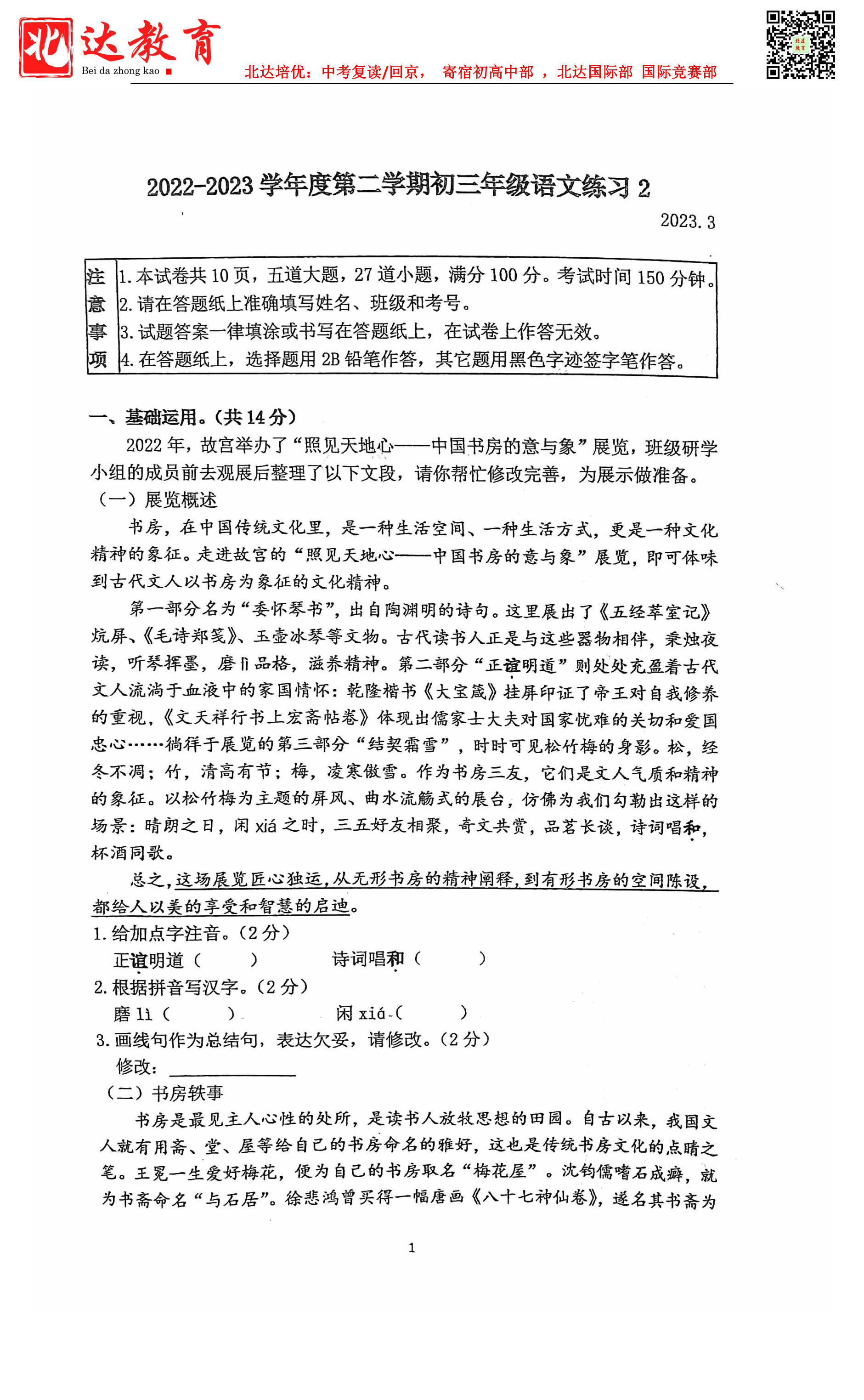 admw360中考网整理了2022-2023学年人大附中九年级下3月月考语文试题,分享给大家。需要的同学赶紧下载练习起来吧。