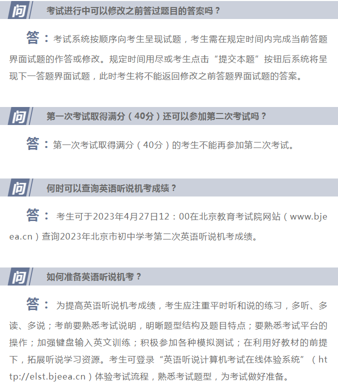 刚刚,北京教育考试院发布了《2023年北京市初中学考英语听说机考第二次考试问题解答》,admw360中考网为大家整理了内容详情,一起来看看吧!