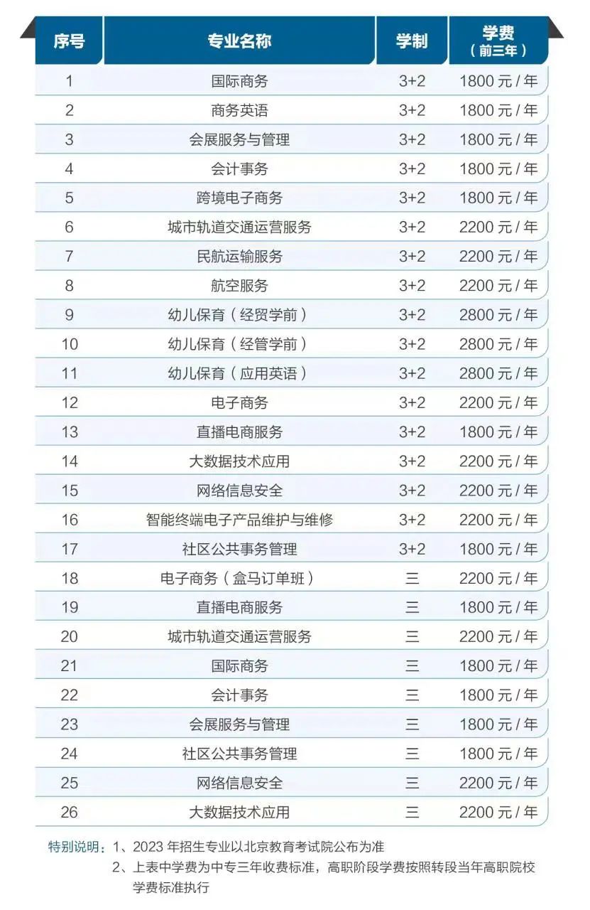 学校专业设置围绕国家“十四五”发展规划和北京市“四个中心”建设,开设现代国际商务服务、国际城市交通服务、学前教育、全域数字化运营专业群,涵盖近20个专业及方向,多个火“热”专业供你选择,未来发展潜力无限!