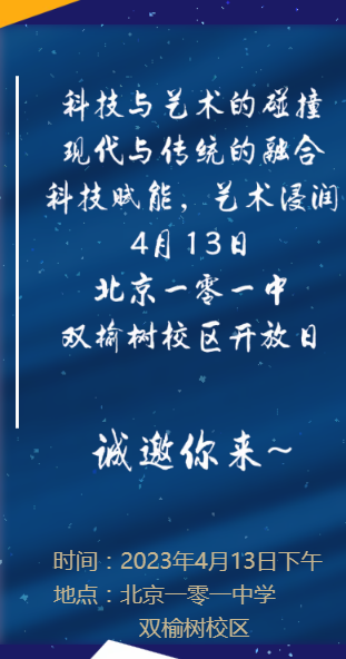 近日,一零一中双榆树校区发布了主题为“科技赋能梦想 艺术浸润人生”科技嘉年华校园开放日活动的邀请函,时间为4月13日13:30-16:00。