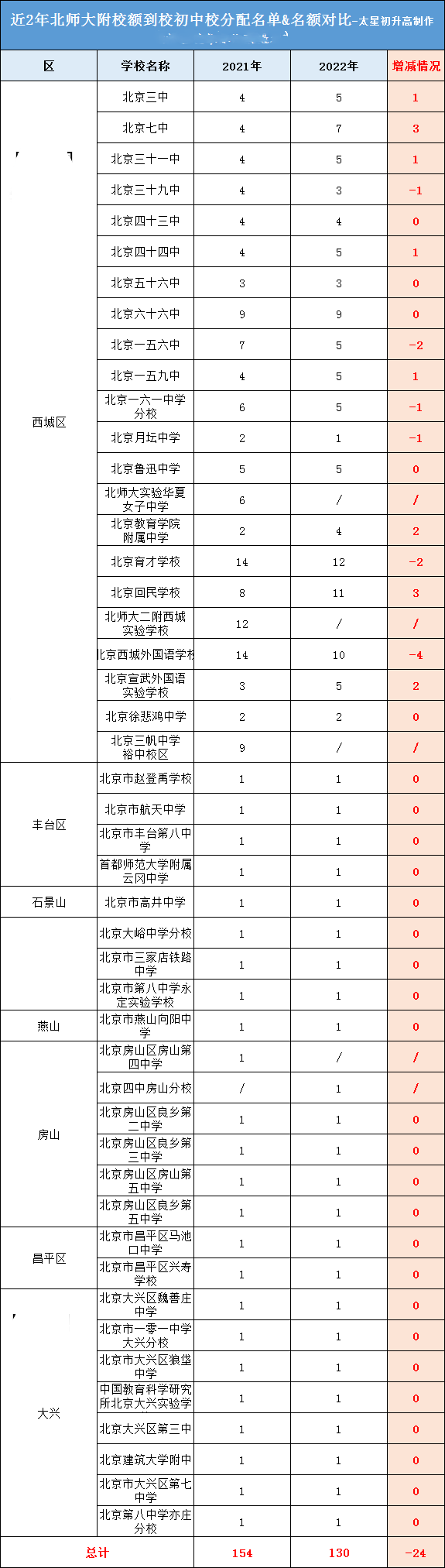 总的来说北师大附中2022年比2021年校额到校名额减少了24个名额,所以想通过校额到校升入北师大附的同学要注意自己所在初中校还有没有校额到校名额,详细分配名额对比见上图。