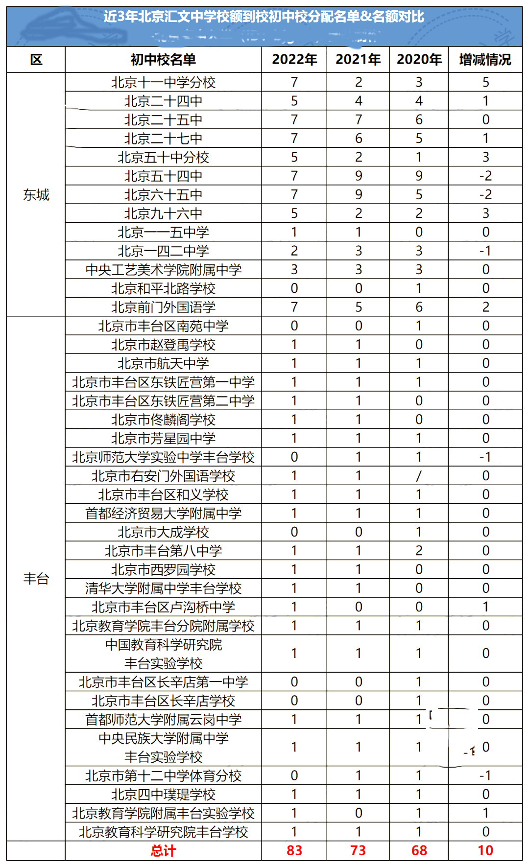 1、由上图可知,近3年汇文中学的校额到校名额分配给了上述初中校,每个学校校额到校名额分配近3年增减情况如上图。