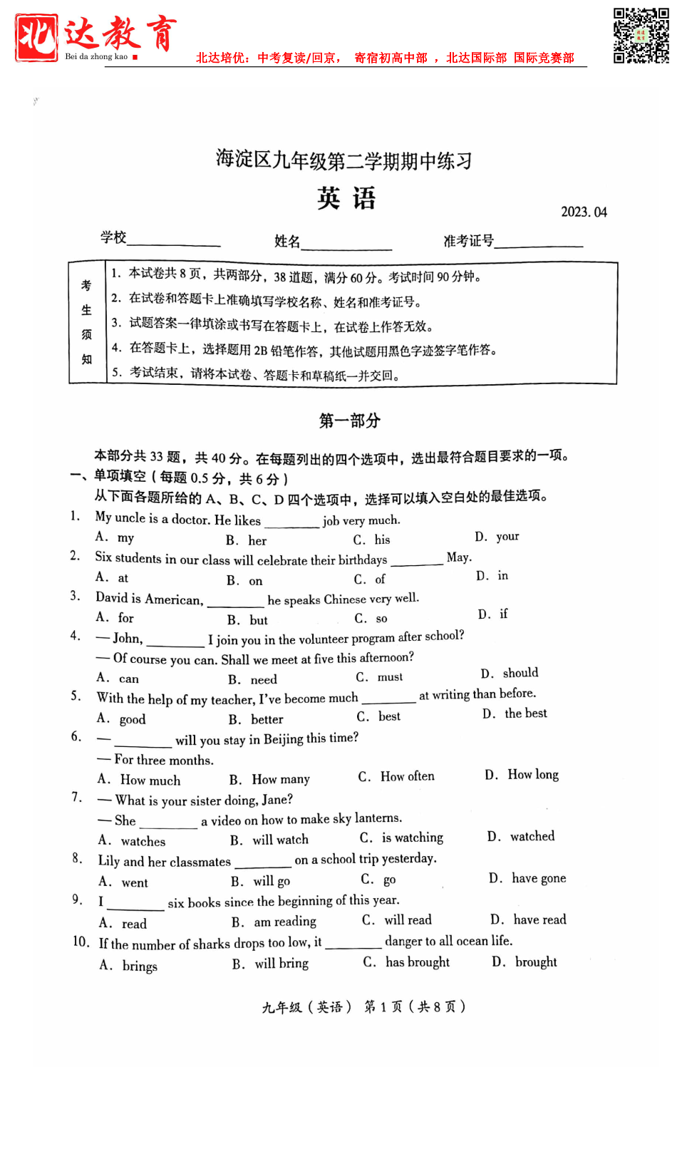 admw360中考网第一时间为大家整理了2023北京海淀区初三一模英语试题及答案,分享给大家。
