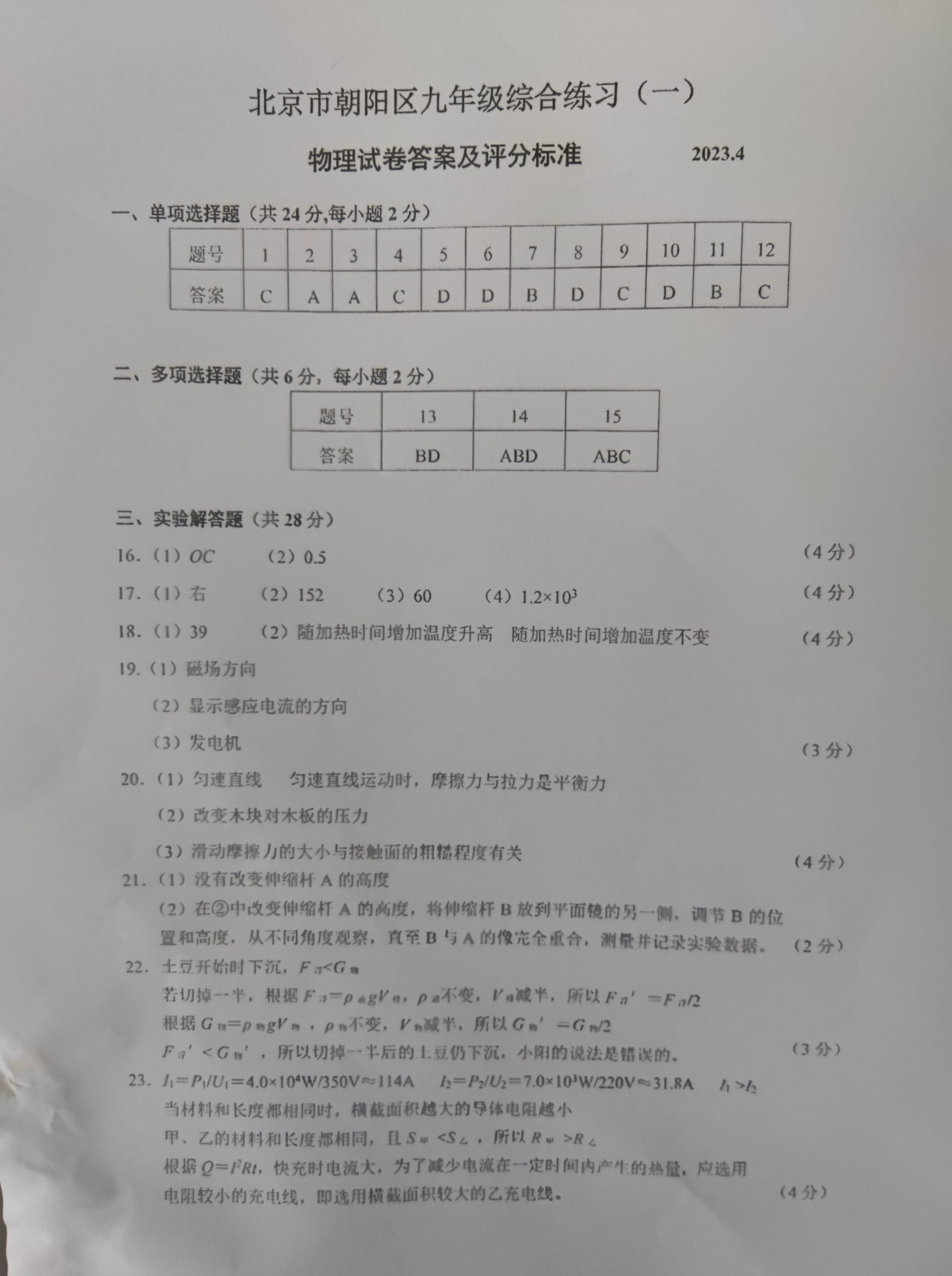admw360中考网第一时间为大家整理了2023北京朝阳区初三一模物理试题及答案,分享给大家。