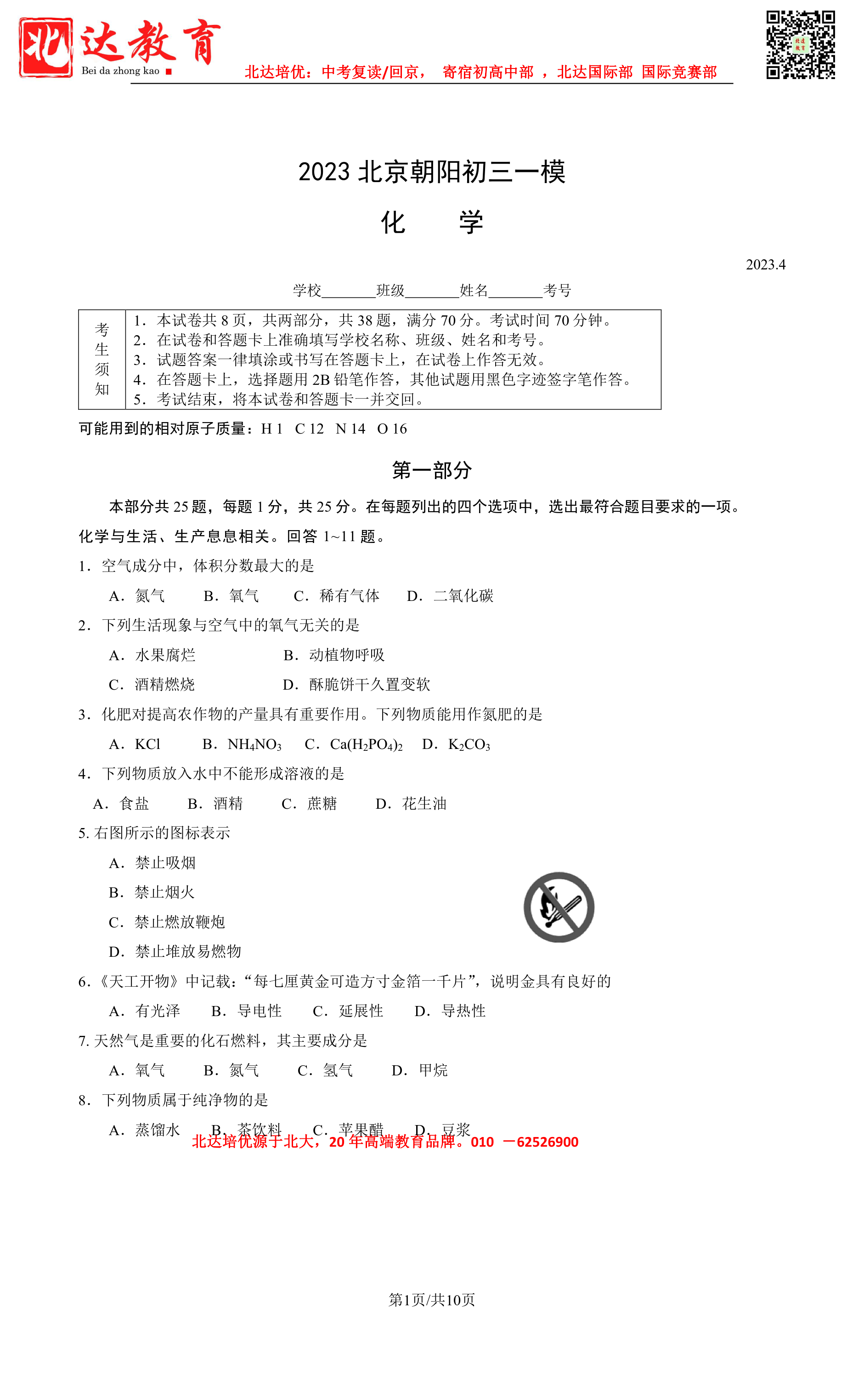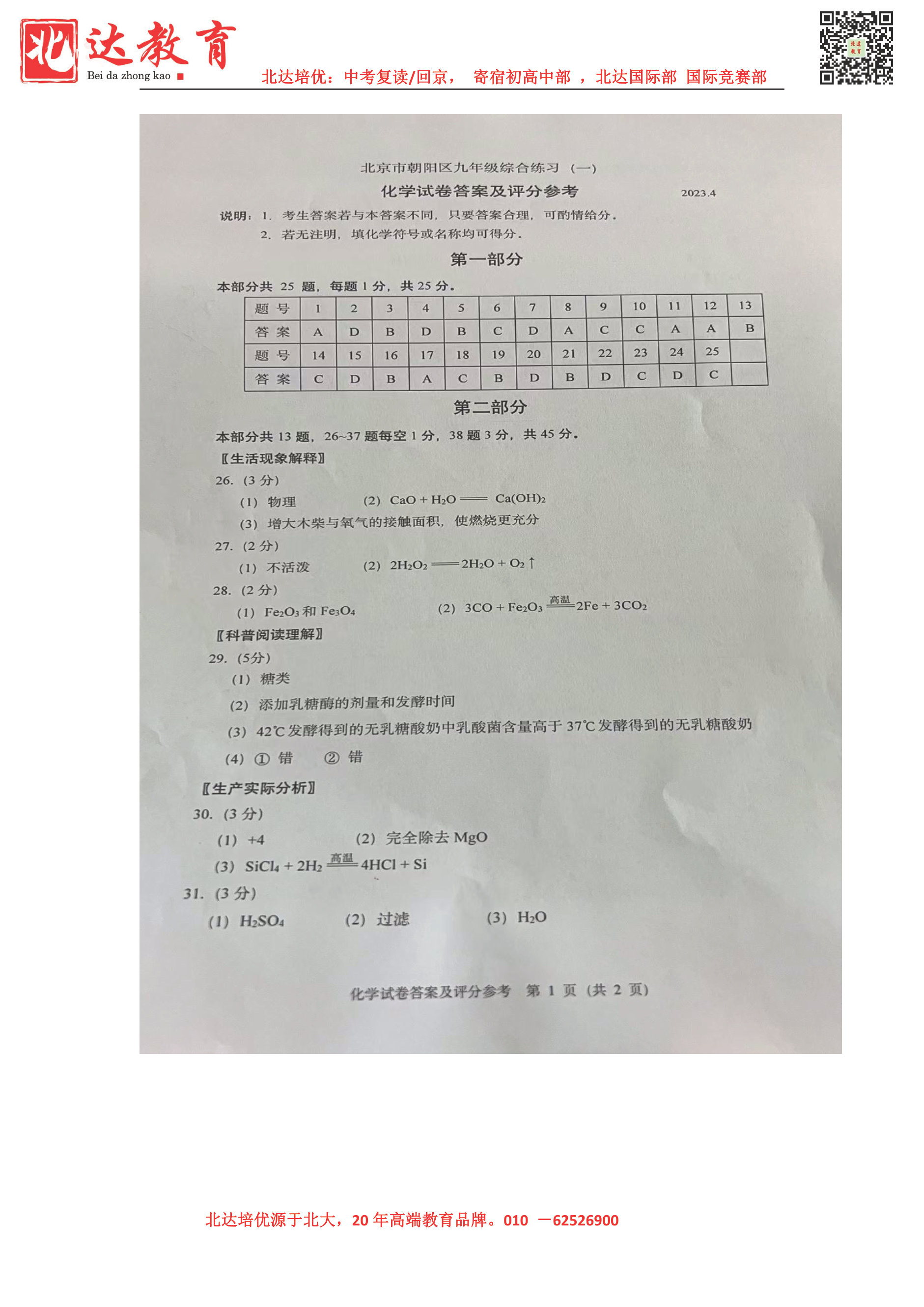admw360中考网第一时间为大家整理了2023北京朝阳区初三一模化学试题及答案,分享给大家。