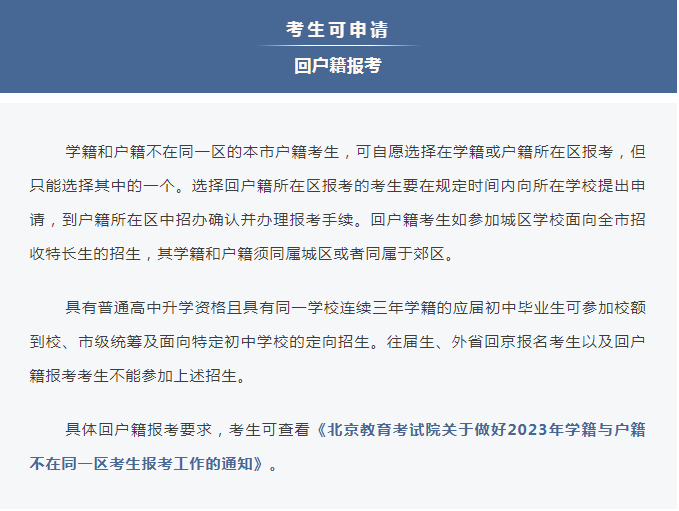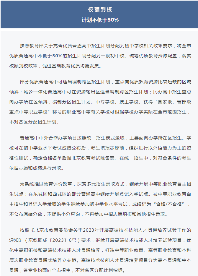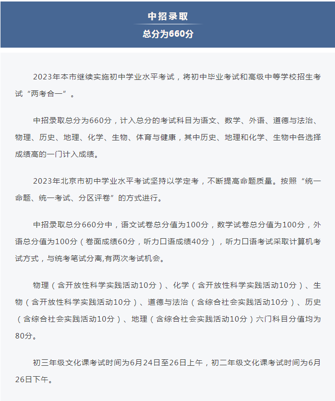 昨日,北京教育考试院发布《关于做好2023年高级中等学校考试招生工作的通知》,2023年中招录取总分为660分,高级中等学校招生实行考后知分填报志愿,其中统一招生志愿今年增至12个,每个志愿可填报2个专业。