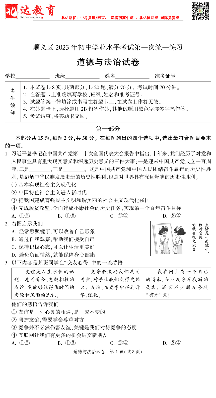 admw360中考网第一时间为大家整理了2023北京顺义区初三一模道法试题及答案,分享给大家。