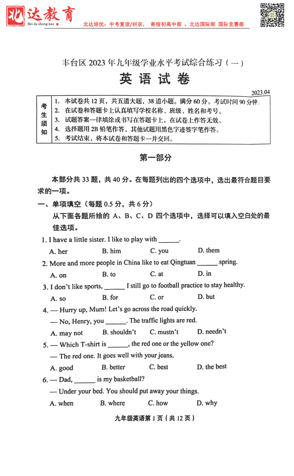 admw360中考网第一时间为大家整理了2023北京丰台区初三一模英语试题及答案,分享给大家。 相关阅读:2023北京各区初三一模试题及答案汇总 2023北京各区初三一模试卷&答案汇…