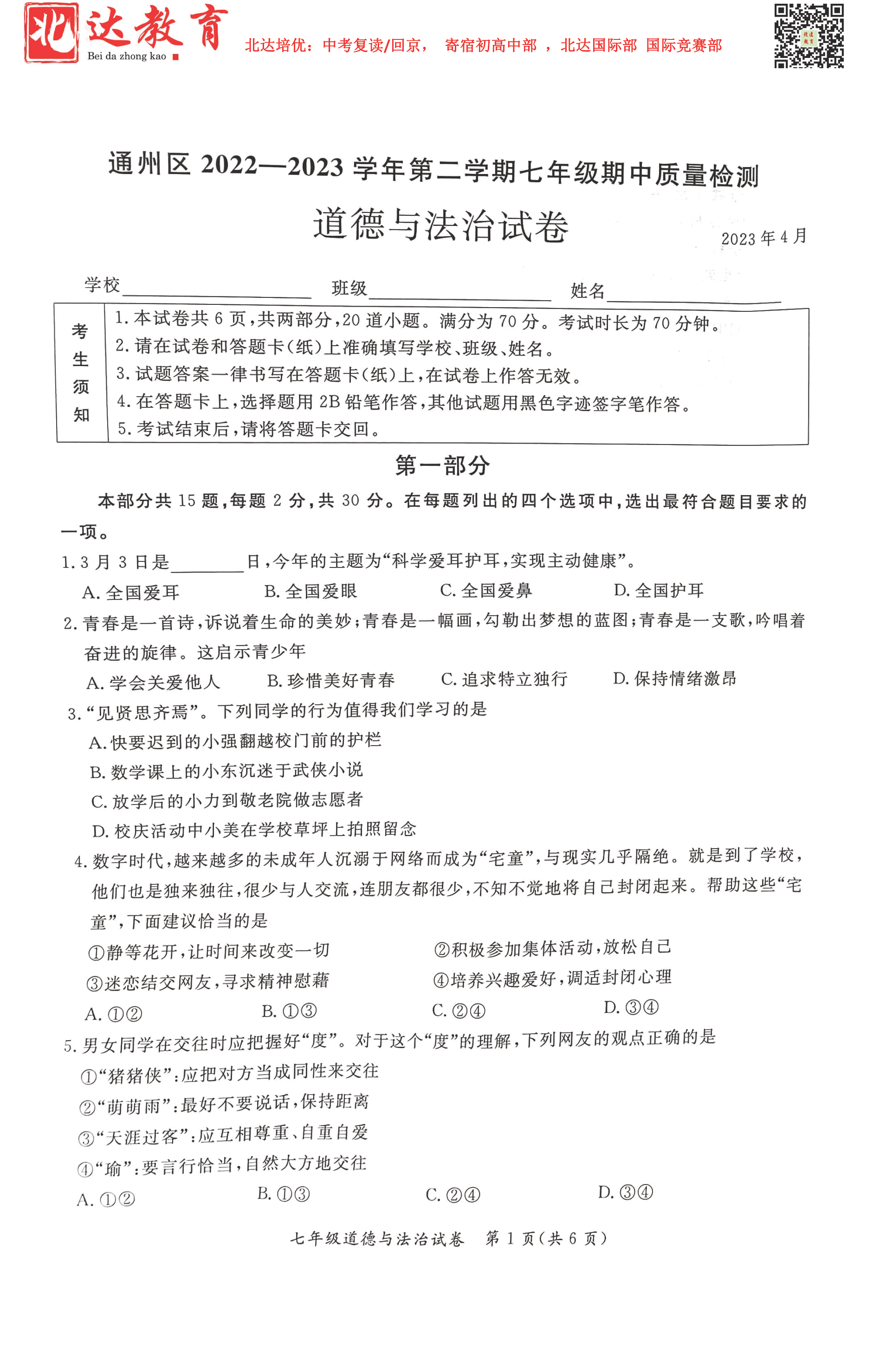 首页 初一试题 2023北京通州区初一下期中道德与法治试题及答案
