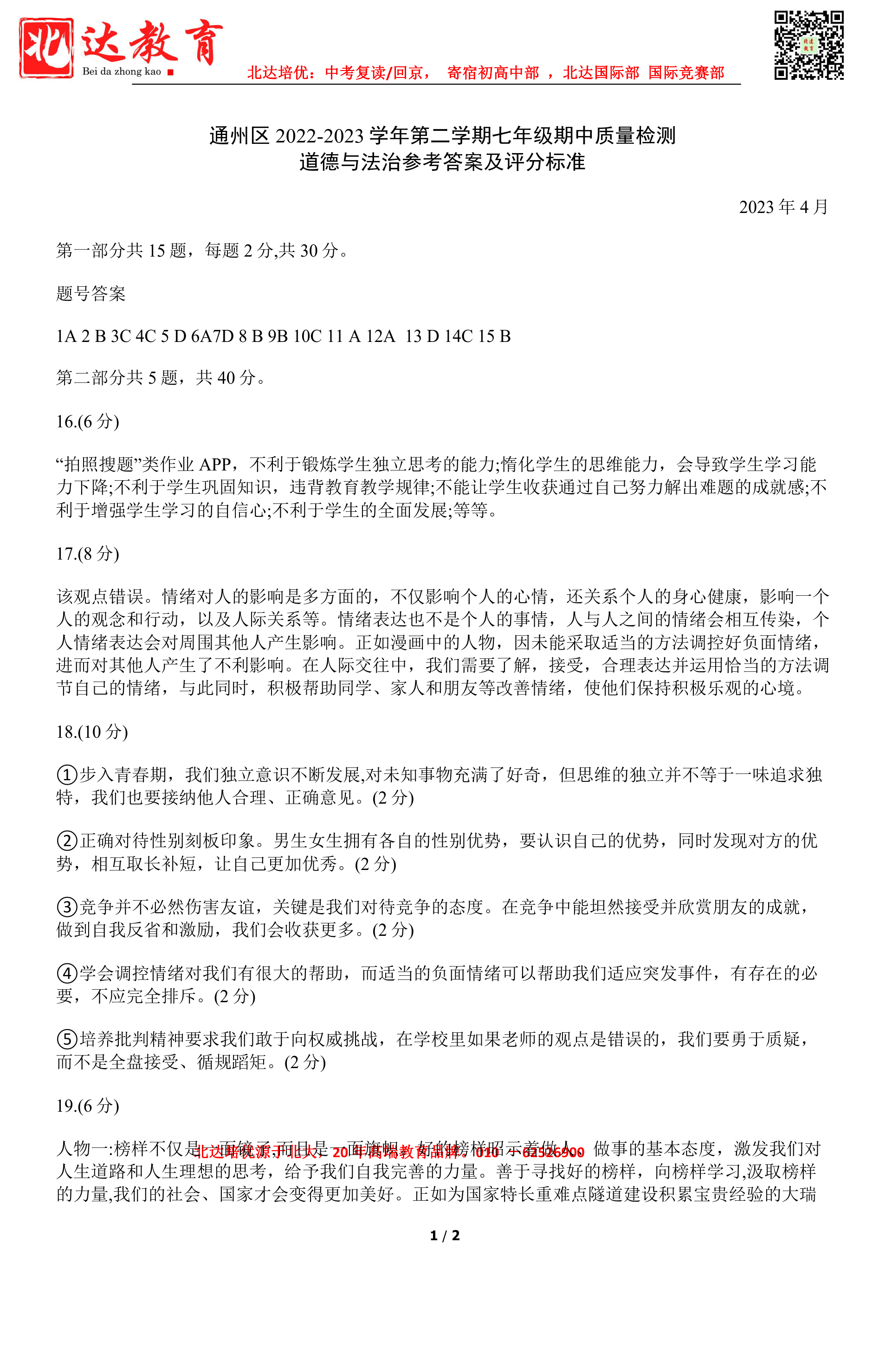 2023学年通州初一道法期中考考试已结束,admw360中考网为大家整理了试题及答案,分享给大家。