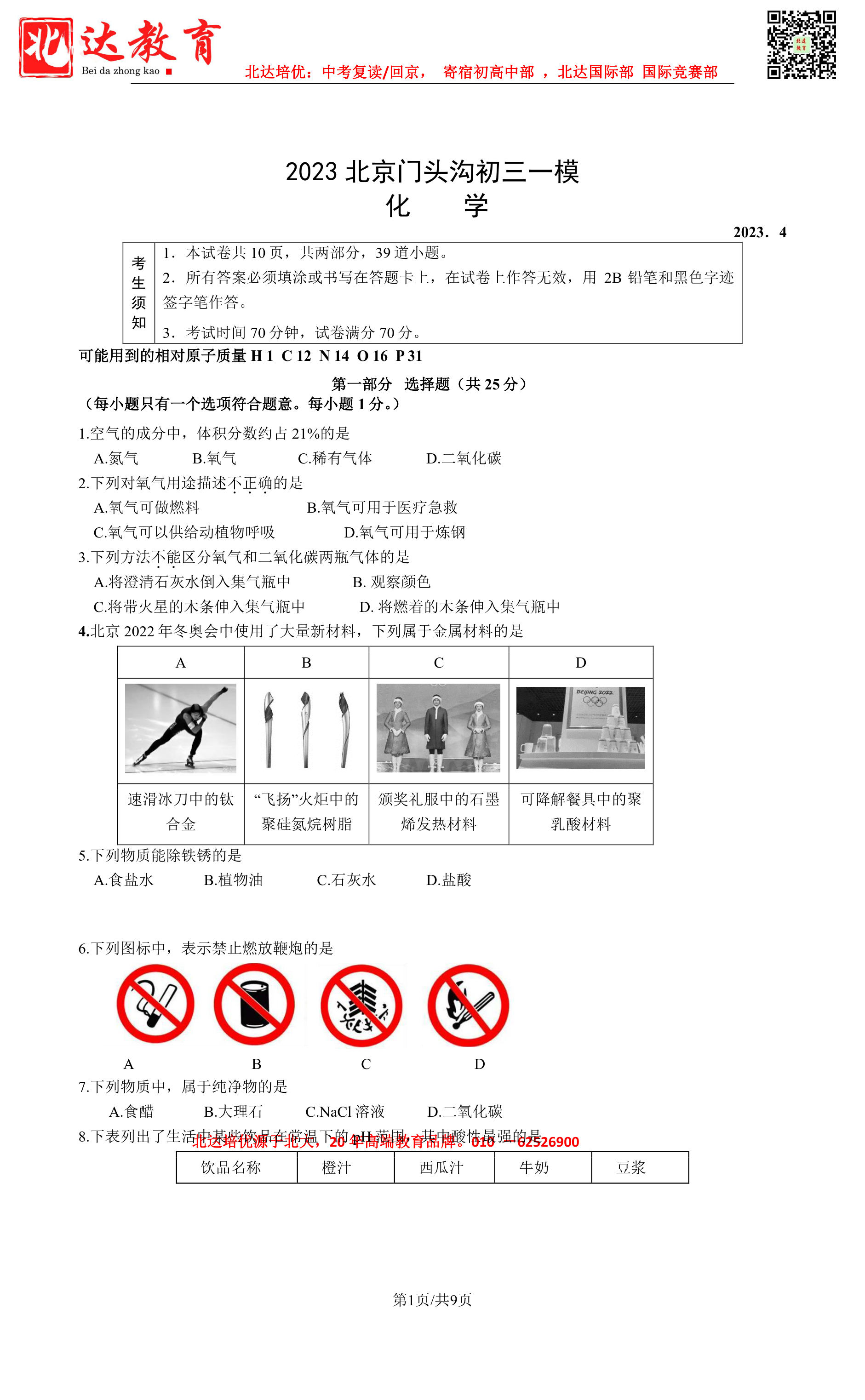 admw360中考网第一时间为大家整理了2023北京门头沟区初三一模化学试题及答案,分享给大家。