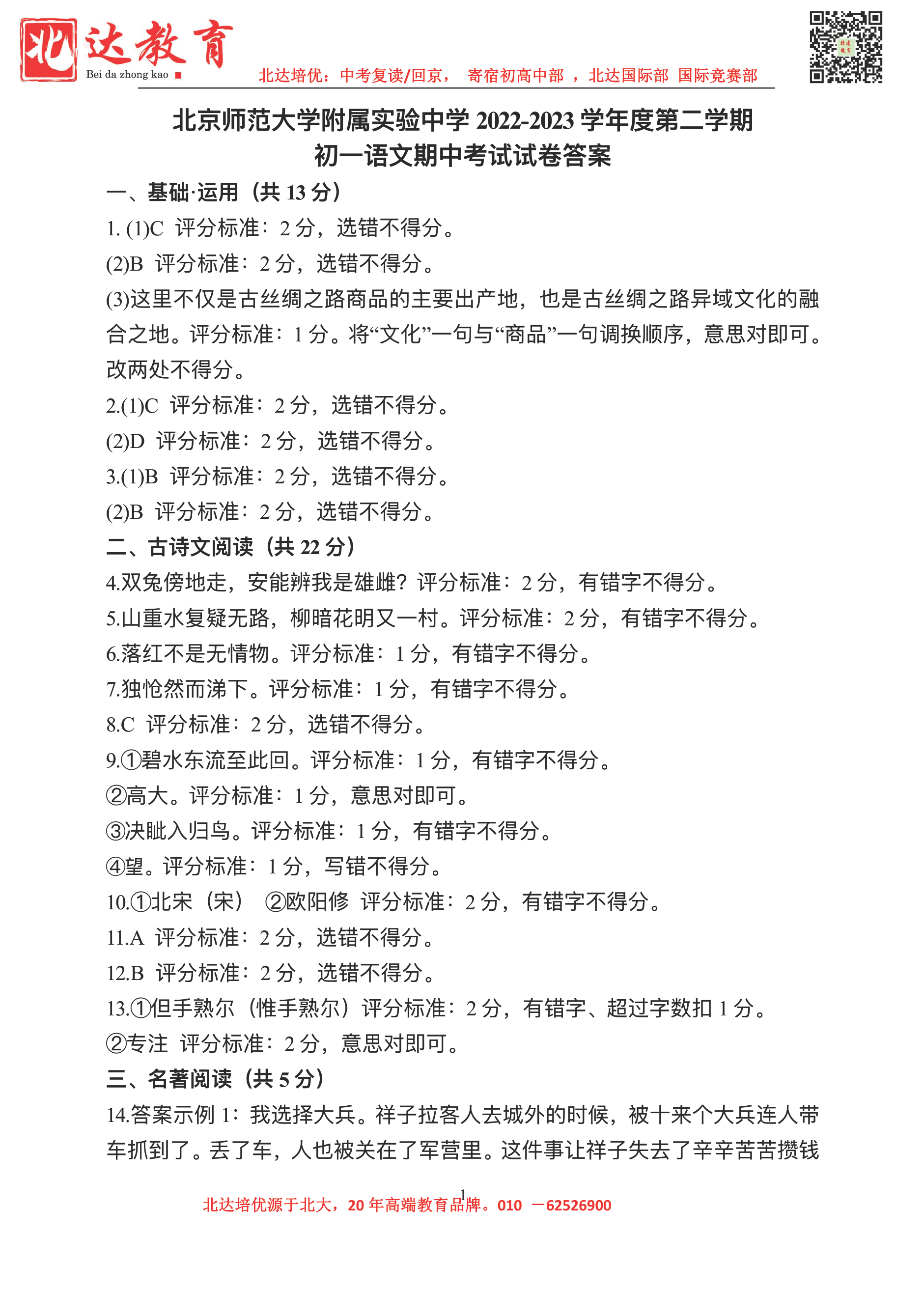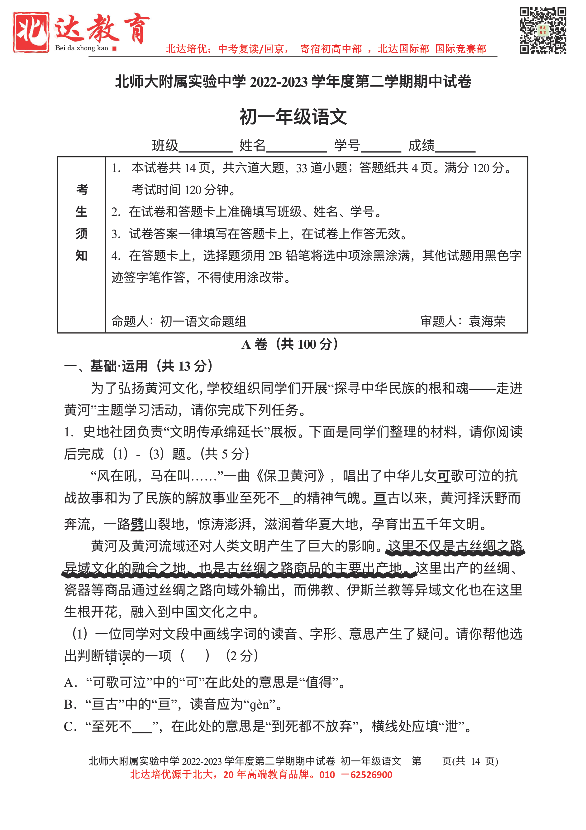 2023学年北师大附属实验中学初一语文期中考考试已结束,admw360中考网为大家整理了试题及答案,分享给大家。