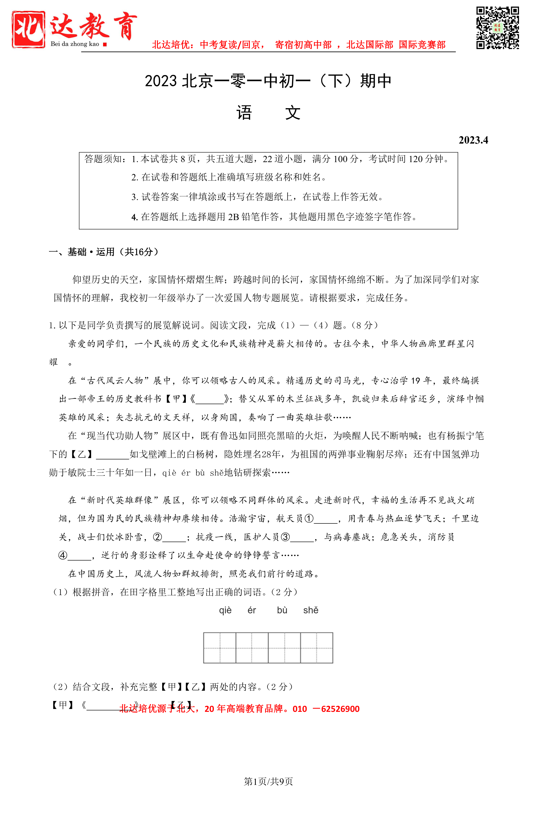2023学年北京一零一集团初一语文期中考考试已结束,admw360中考网为大家整理了试题及答案,分享给大家。