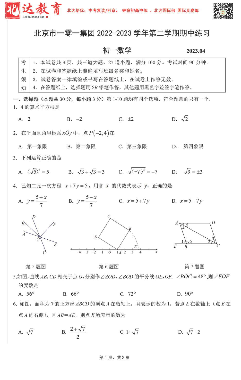 2023学年北京一零一集团初一数学期中考考试已结束,admw360中考网为大家整理了试题及答案,分享给大家。