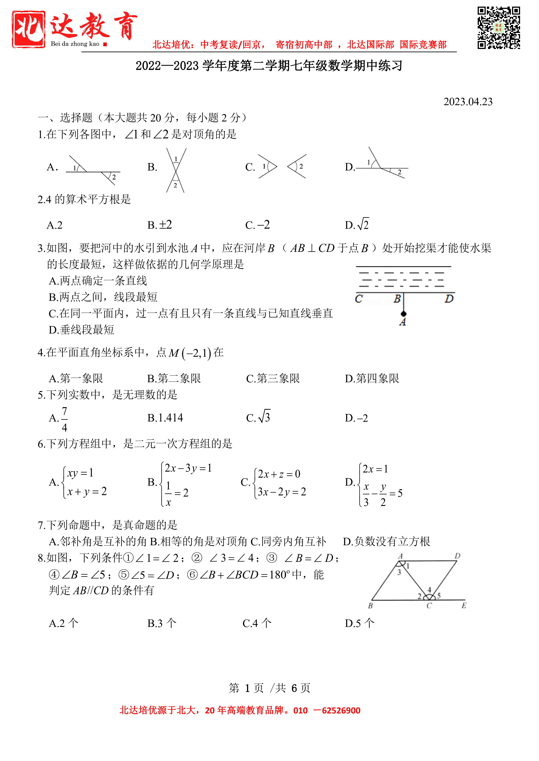 2023学年北京理工大附中初一数学期中考考试已结束,admw360中考网为大家整理了试题及答案,分享给大家。 相关阅读:2023北京各区初一(下)期中试题及答案汇总 2023北京各区初一下期…