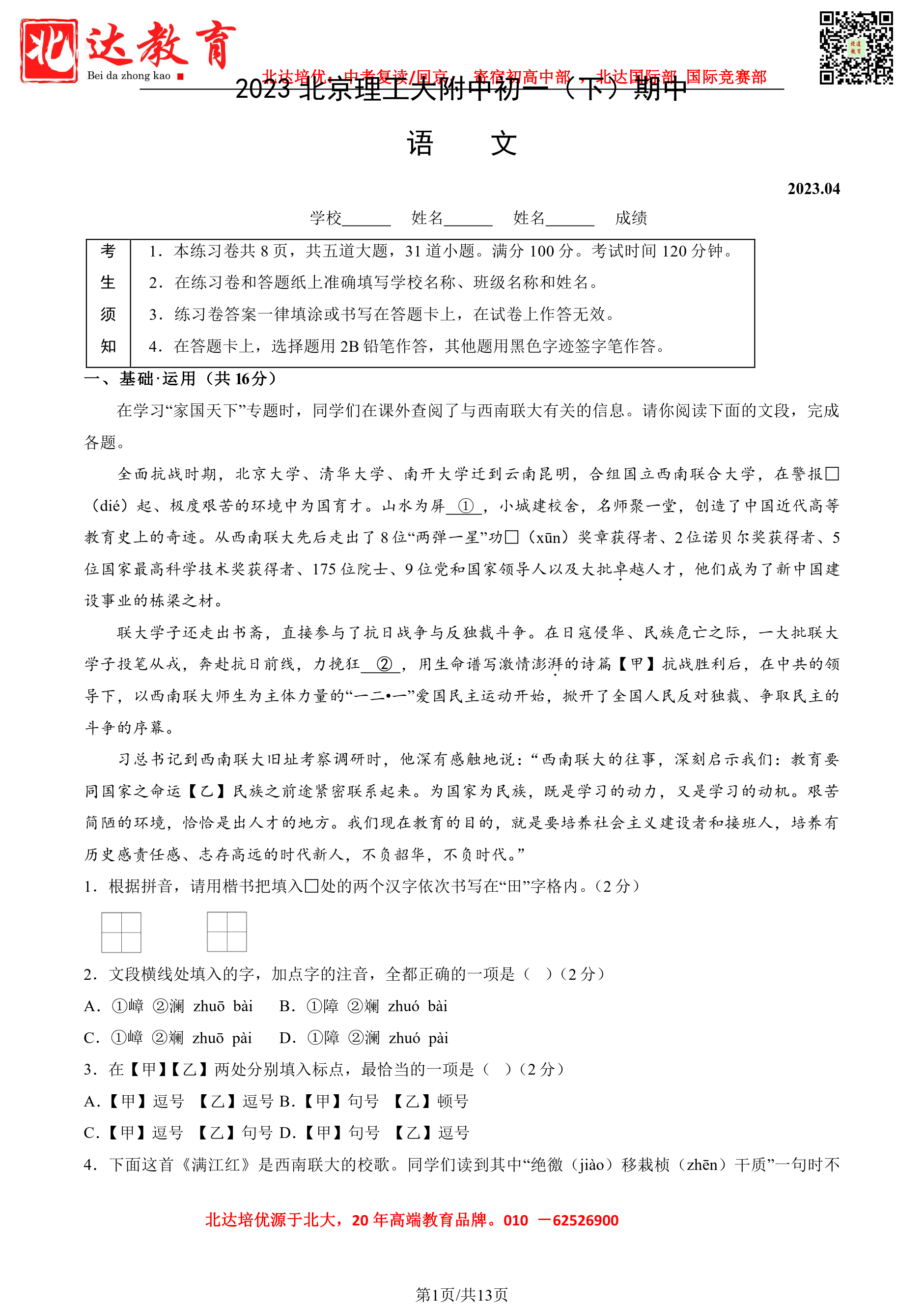 2023学年北京理工大附中初一语文期中考考试已结束,admw360中考网为大家整理了试题及答案,分享给大家。