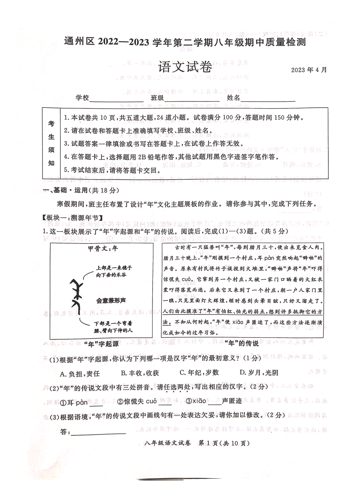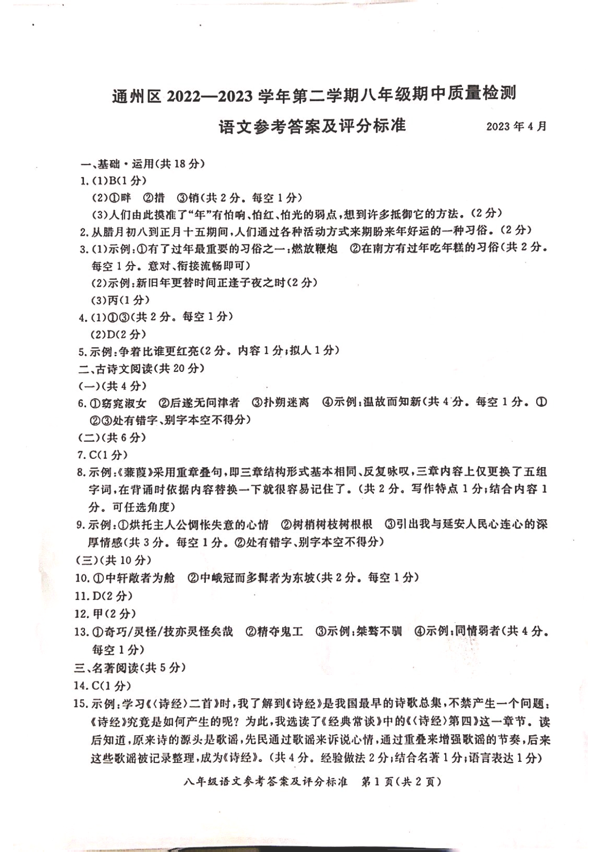 首页 初二试题 2023北京通州区初二下期中语文试卷及答案