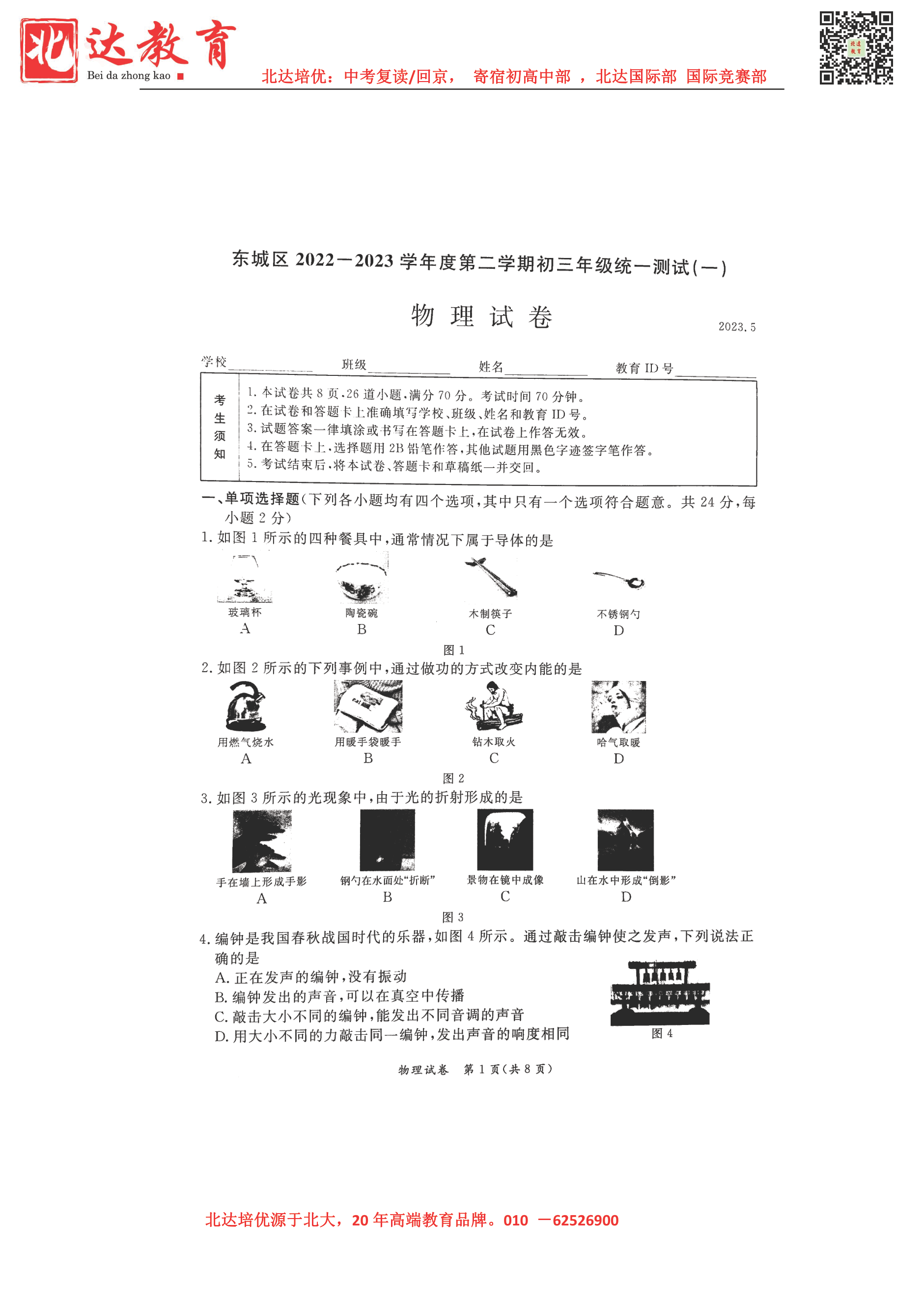 admw360中考网第一时间为大家整理了2023北京东城区初三一模物理试题及答案,分享给大家。