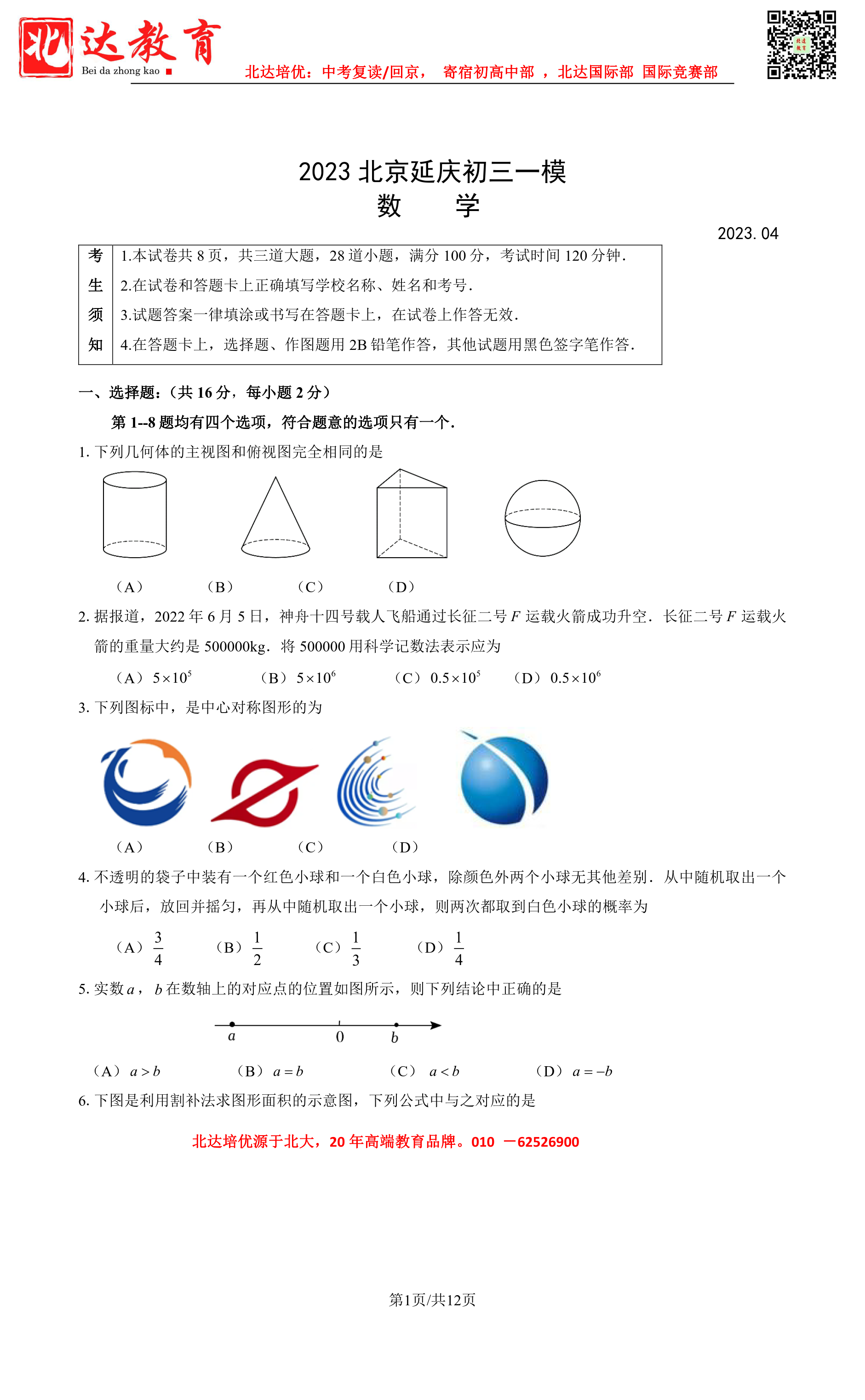 admw360中考网为大家整理了2023北京延庆区初三一模数学试题及答案,分享给大家。