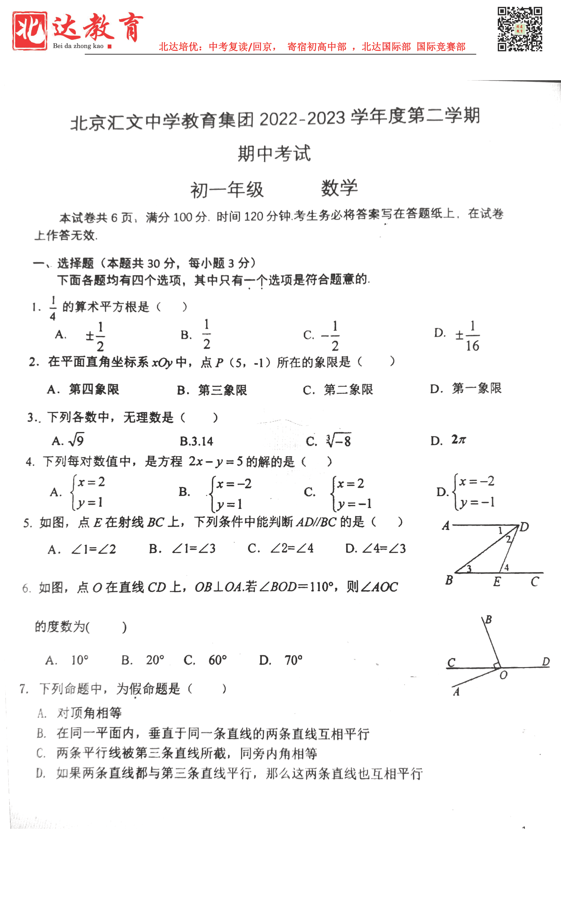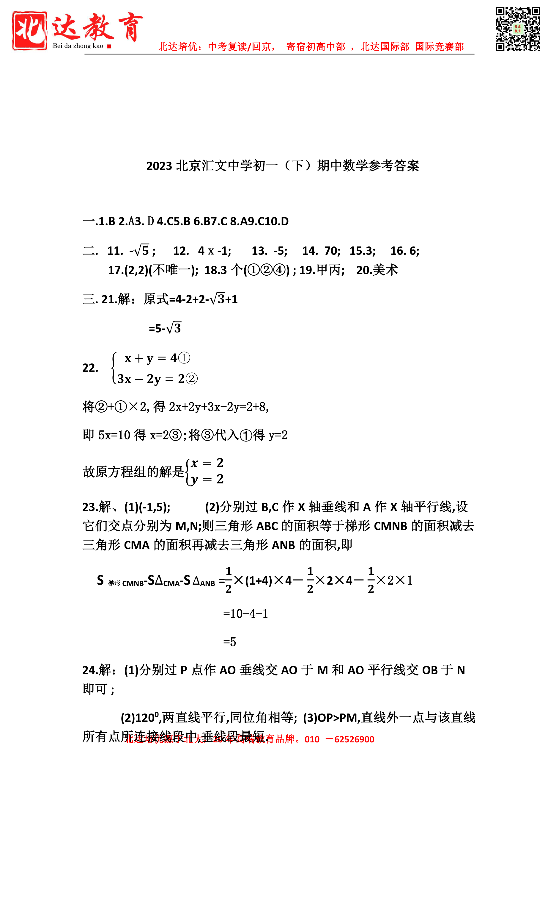 2023学年北京汇文中学初一数学期中考考试已结束,admw360中考网为大家整理了试题及答案,分享给大家。