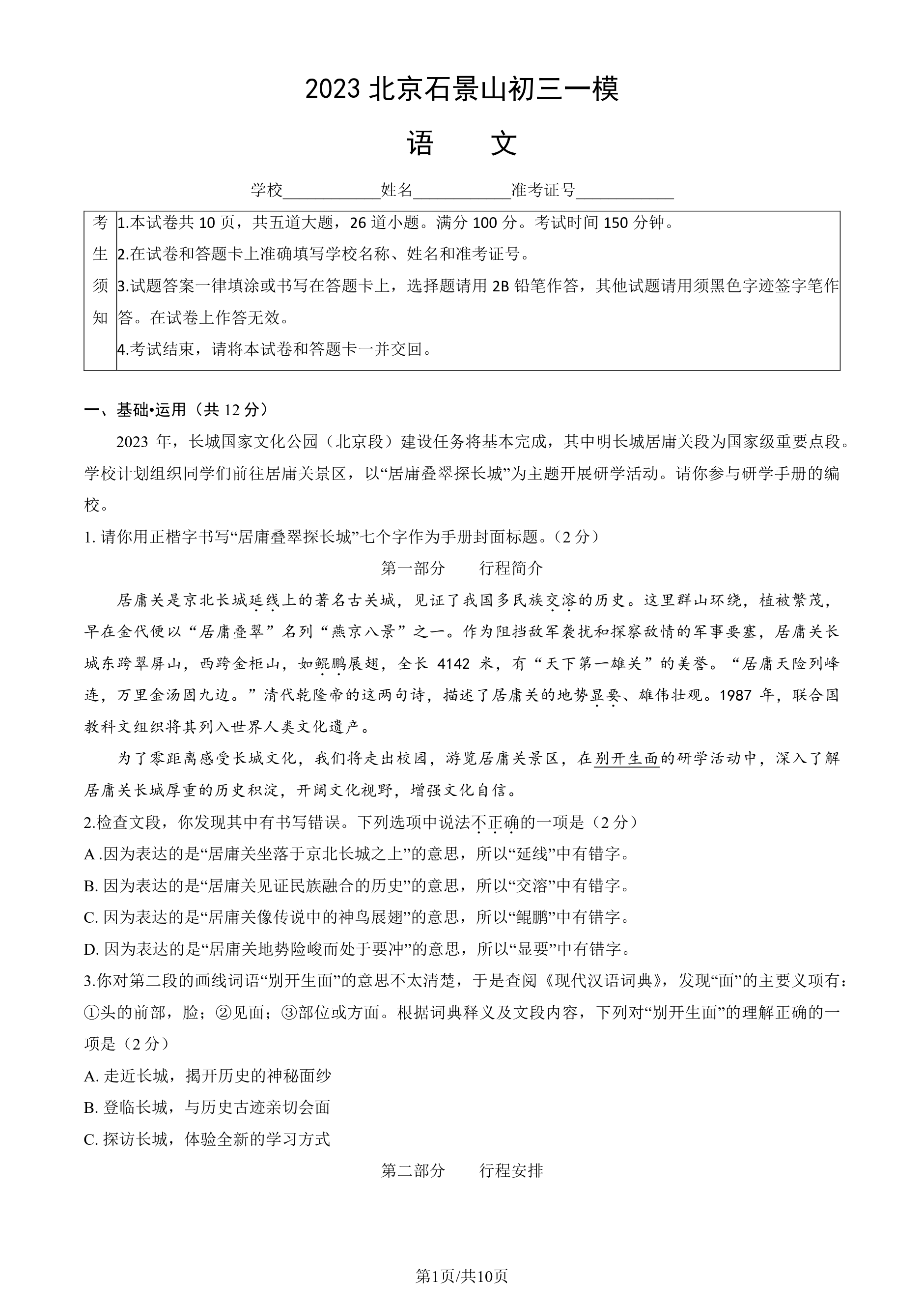 admw360中考网为大家整理了2023北京石景山区初三一模语文试题及答案,分享给大家。