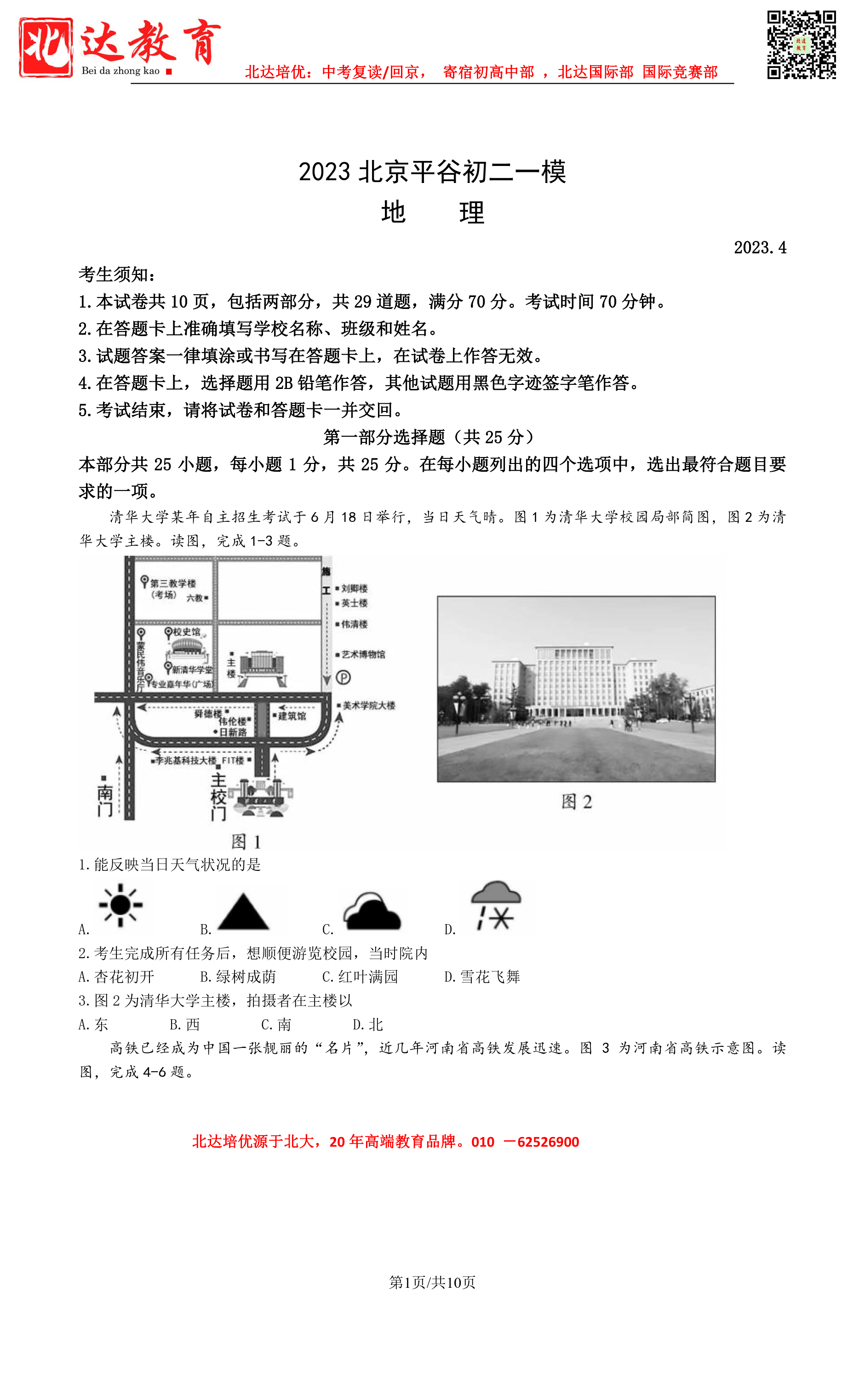 2023北京平谷区初二一模地理考已结束,admw360中考网为大家整理了 试题及答案,分享给大家。