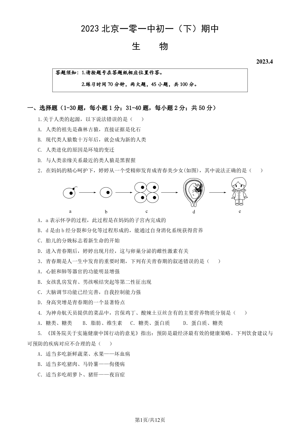 2023学年北京一零一初一生物期中考考试已结束,admw360中考网为大家整理了试题及答案,分享给大家。