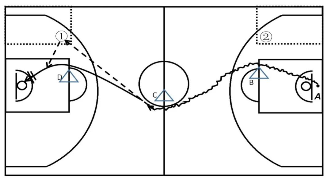 在标准篮球场(28米×15米)进行测验。队员站位(端线中点处)及移动路线如下图所示。三角为标志杆,①和②为同队队员,发令的同时开始计时,运动员按图示路线从A点(端线中点处)用右手运球,绕过标志杆B后,用体前变向换左手运球,当绕过标志杆C脚接触前场地面后,立即用双手胸前传球将球传给①再绕过标志杆D后接①的回传球用右手上篮,中篮后用左手运球立即按原路线返回,运球绕过标志杆D后用体前变向换右手运球,绕过标志杆C传球给②,再绕过标志杆B接②的回传球用左手上篮。见图1:全场运球、传接球投篮图示。