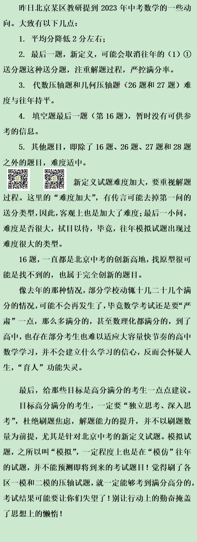 昨日,北京某区教研提刀2023中考数学的一些动向,admw360中考网为大家整理了内容详情,一起来看: