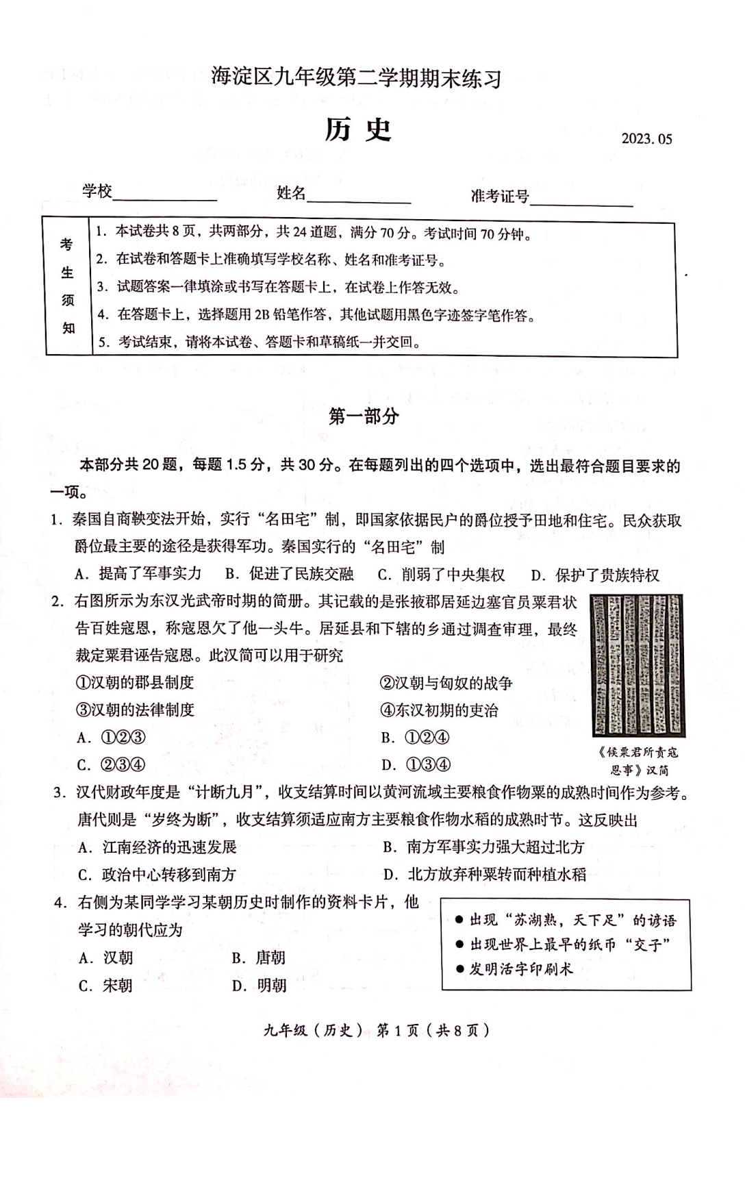 2023北京海淀区初三二模正在进行,admw360中考网为大家整理了历史试题及答案,分享给大家。