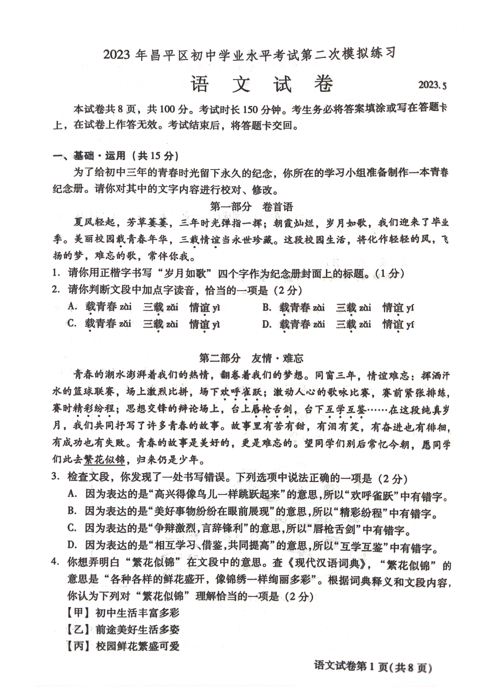 2023北京昌平区初三二模正在进行,admw360中考网为大家整理了语文试题及答案,分享给大家。